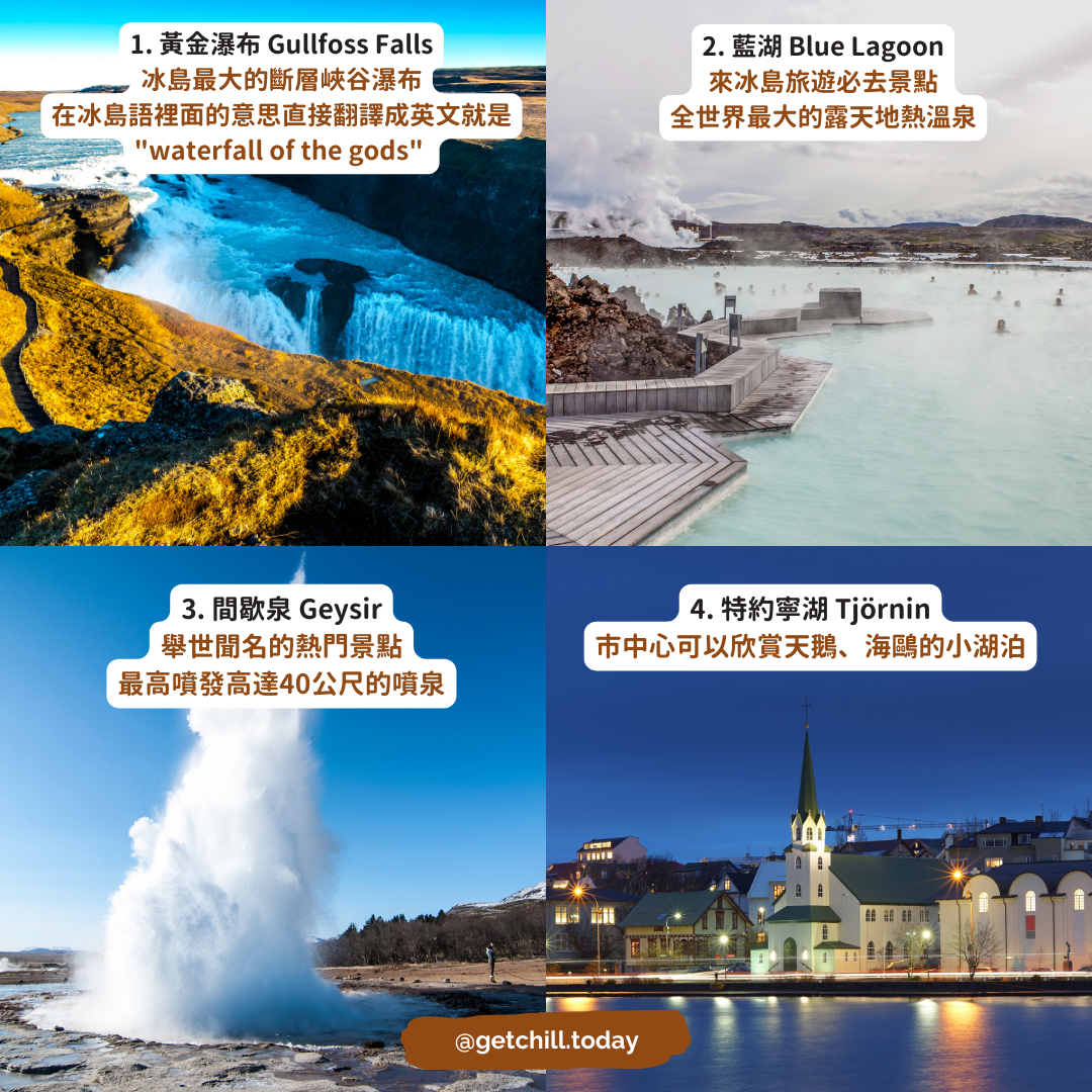 1/黃金瀑布 Gullfoss Falls:被譽為「眾神之瀑布」,黃金瀑布是冰島最大的斷層峽谷瀑布。站在瀑布前,您會感受到大自然的力量與美麗,水流從高處傾瀉而下,氣勢磅礡。