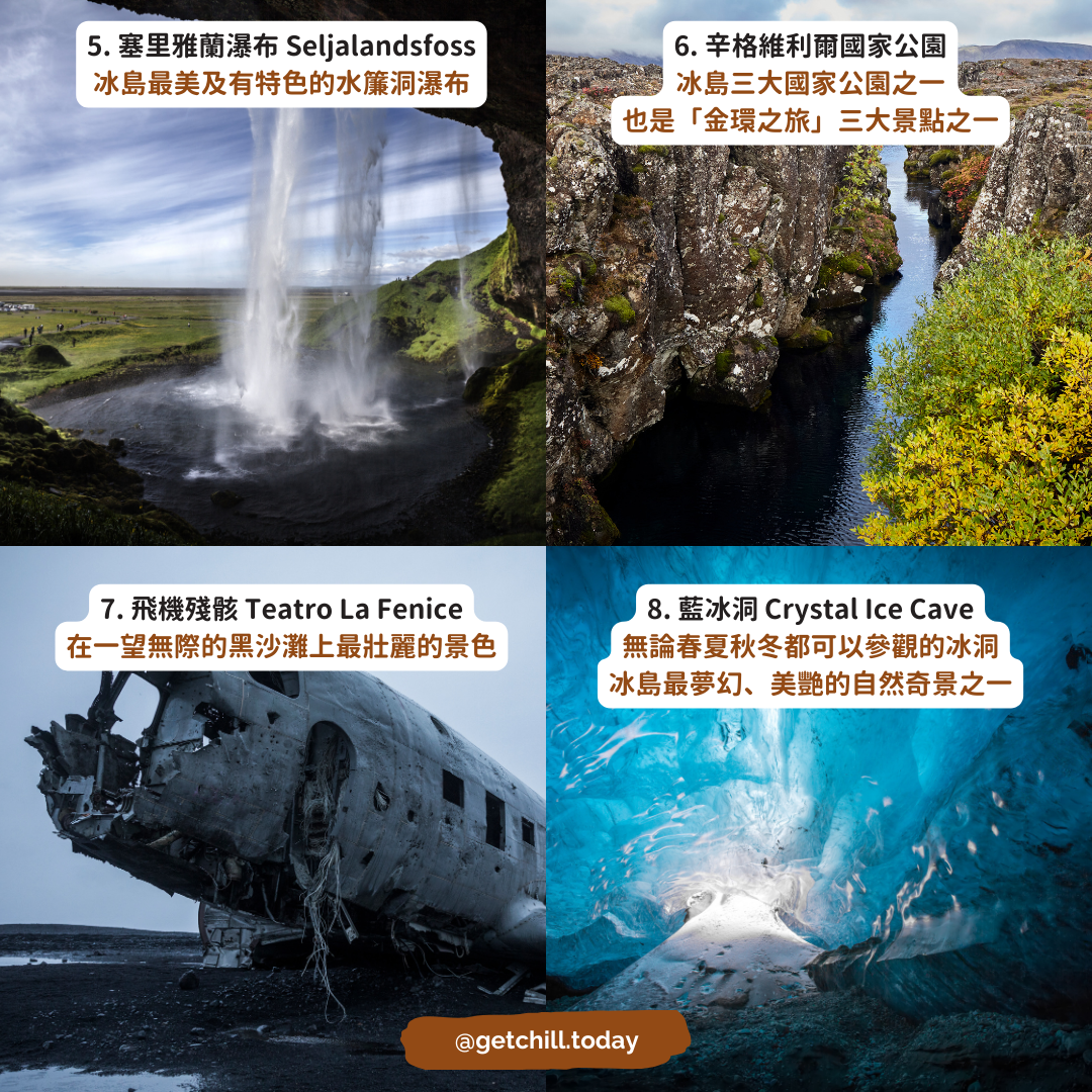 8/藍冰洞 Crystal Ice Cave:無論春夏秋冬,您都可以參觀這些夢幻般的冰洞。它們是冰島最夢幻、最美麗的自然奇觀之一,讓您有機會探索冰川下的神秘世界。