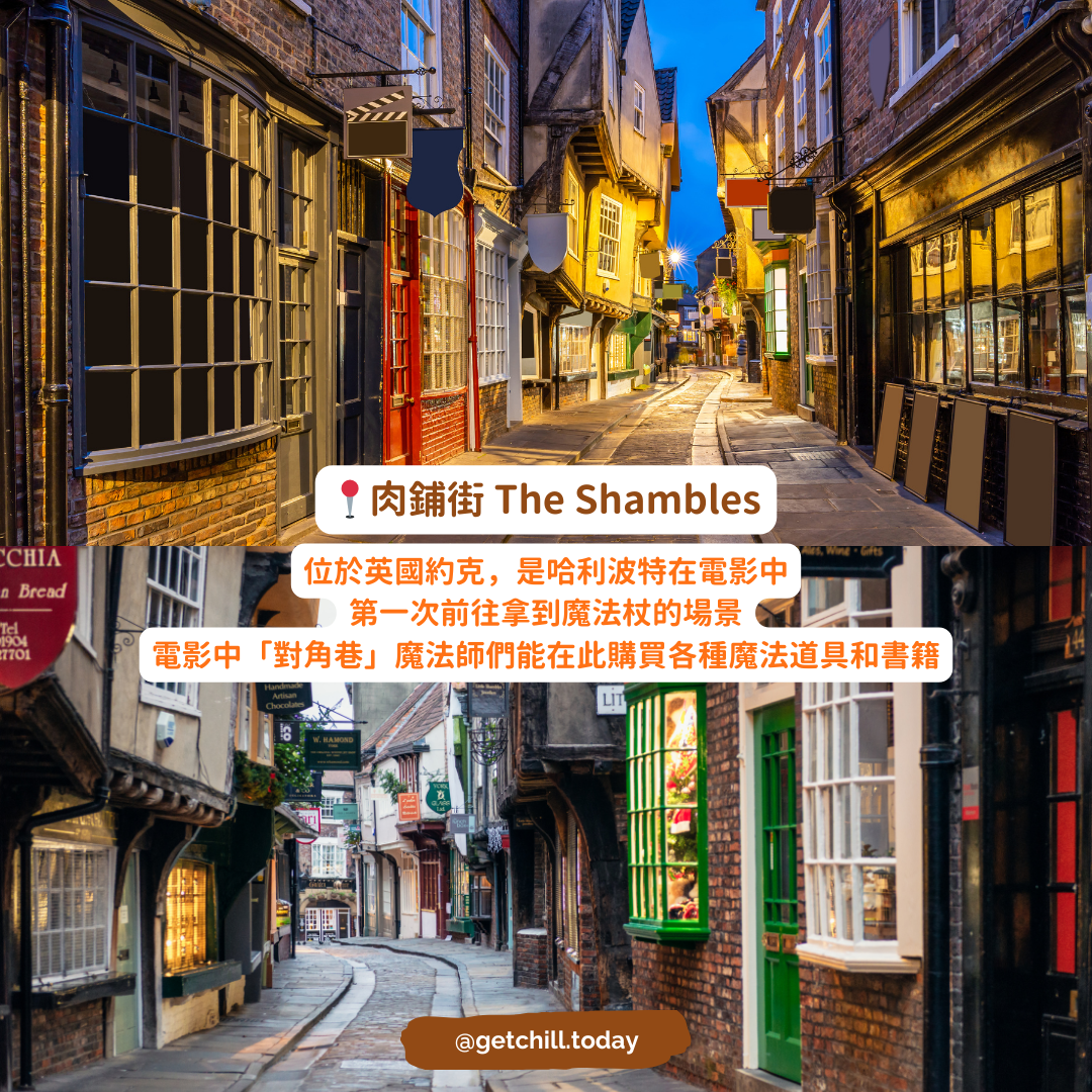 肉鋪街(The Shambles):位於英國約克,是《哈利波特》電影中「對角巷」的原型。遊客可以體驗到電影中哈利第一次購買魔法杖的場景。
