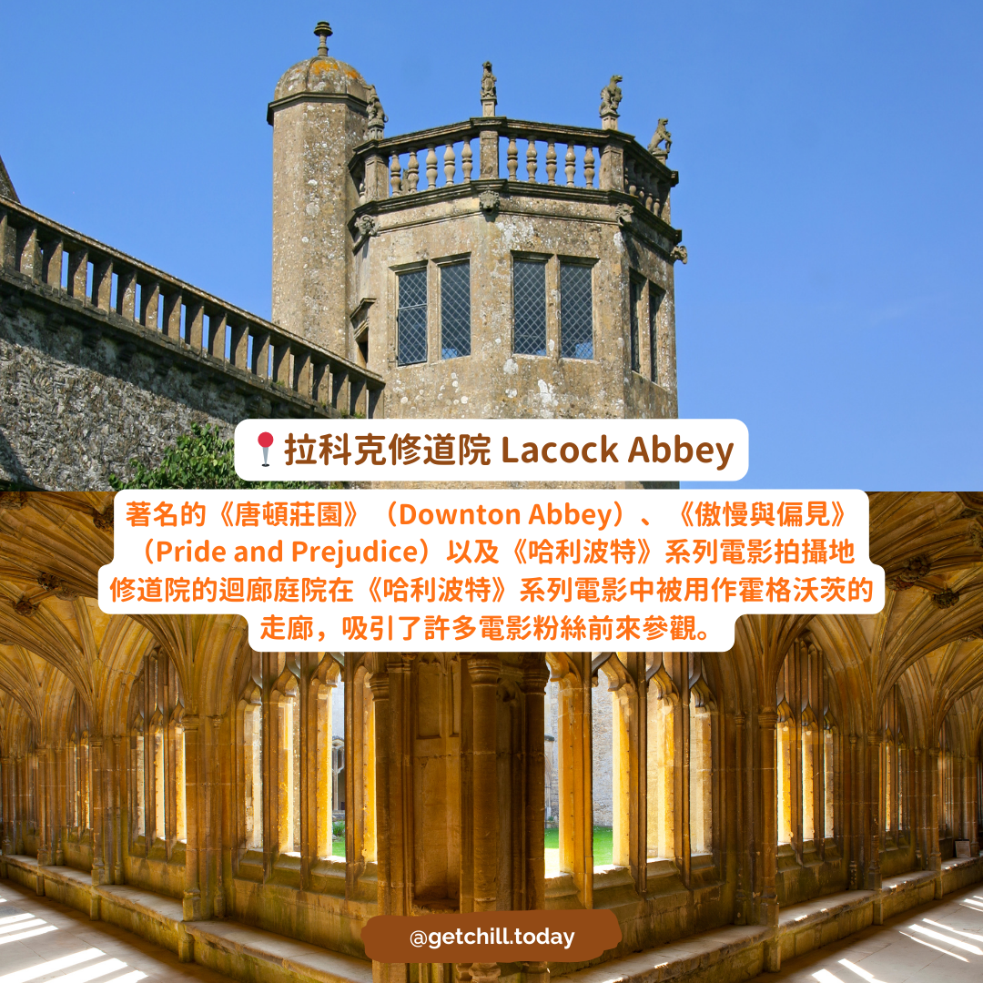 拉科克修道院(Lacock Abbey):位於英格蘭西南部,是多部電影的拍攝地,包括《唐頓莊園》和《傲慢與偏見》。在《哈利波特》系列中,修道院的迴廊庭院被用作霍格沃茨的走廊。