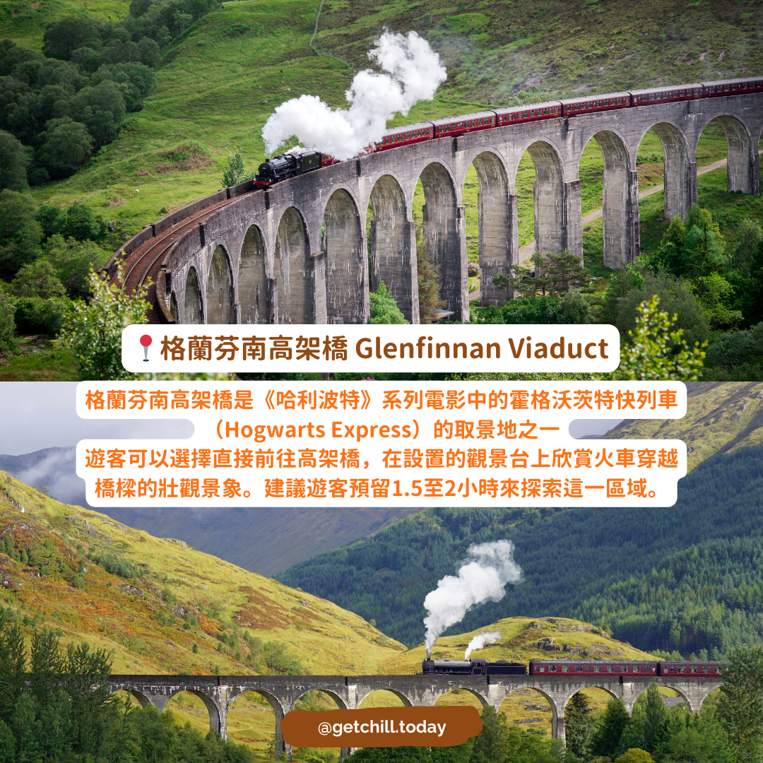 格蘭芬南高架橋(Glenfinnan Viaduct):位於蘇格蘭高地,是《哈利波特》電影中霍格沃茨特快列車經過的場景之一。遊客可以在觀景台上欣賞火車穿越高架橋的壯觀景象。