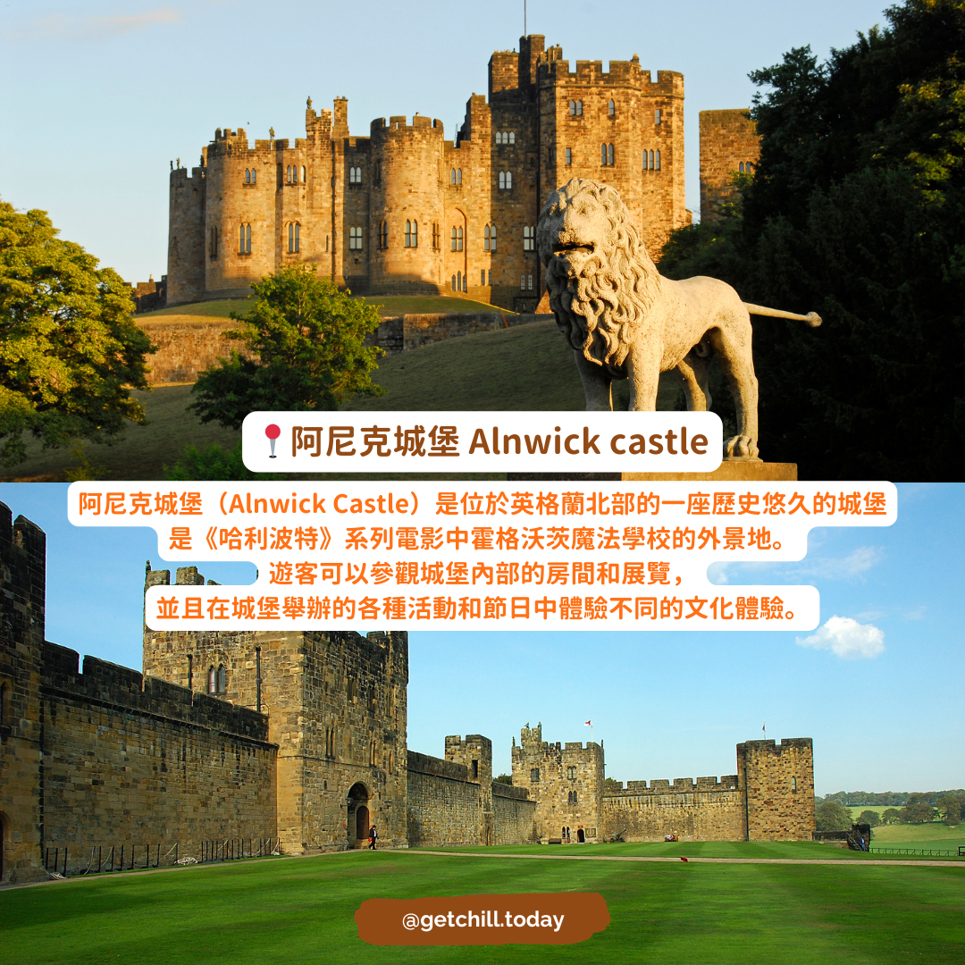 阿尼克城堡(Alnwick Castle):位於英格蘭北部,是《哈利波特》電影中霍格沃茨魔法學校的外景地。遊客可以參觀城堡內部,並參加城堡舉辦的活動和節日。