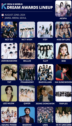 2024 K-World Dream Awards是韓國相當重大的Kpop大賞,展示了韓國娛樂業的全球影響力,除了授獎,藝人們還會帶來精彩的演出,而其中陣容也非常鼎盛:NCT 127、NCT WISH、aespa、ITZY、ZEROBASEONE、TOMORROW X TOGETHER、ILLIT、QWER、河成雲、白虎、BIBI等等,粉絲們切勿錯過!