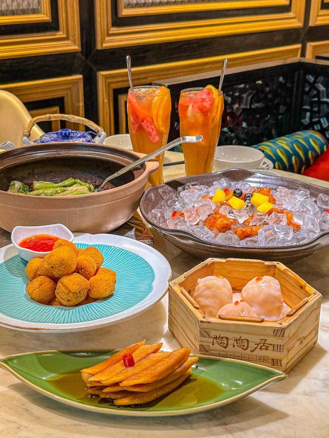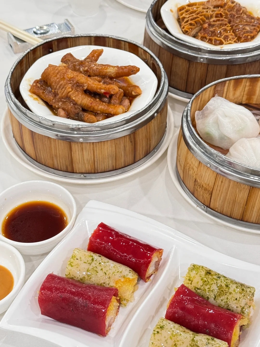 - 特色菜:金莎紅米腸、松化雞蛋撻、荔灣艇仔粥、蒸鳳爪、蝦餃皇。