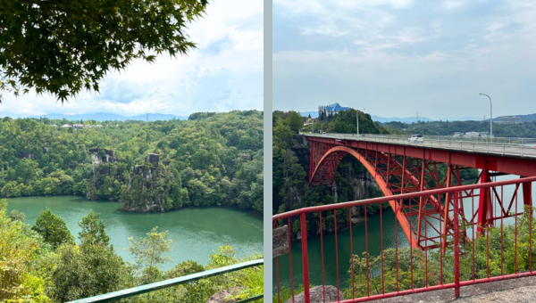 天然斷崖展望台,在紅葉季節來可以看到絕美景色!惠那峽是大約80年前攔截木曾川建造大井大壩時形成的人造湖,1920年由地理學家志賀重昴命名為惠那峽。惠那峽分佈著受自然侵蝕而形成的奇岩怪石,從大井水壩將木曾川攔截而成的人造湖開始一直延續至上遊的中津川。猶如刺入地面的傘岩,這是國家的天然保護物,它與覆蓋著褐紅色苔的紅岩,都是峽谷中的奇岩怪石的代表。 春季的漣公園裏,約有200棵櫻花樹盛開,與美麗的杜鵑花相互輝映。夏季有濃綠樹木映襯著紅色的惠那峽大橋,秋季則有紅葉和楓葉為湖面增添色彩。到了冬季,鴛鴦和椋鳥就會飛來,適合進行鳥類觀測。一年四季,惠那峽的魅力各不相同。