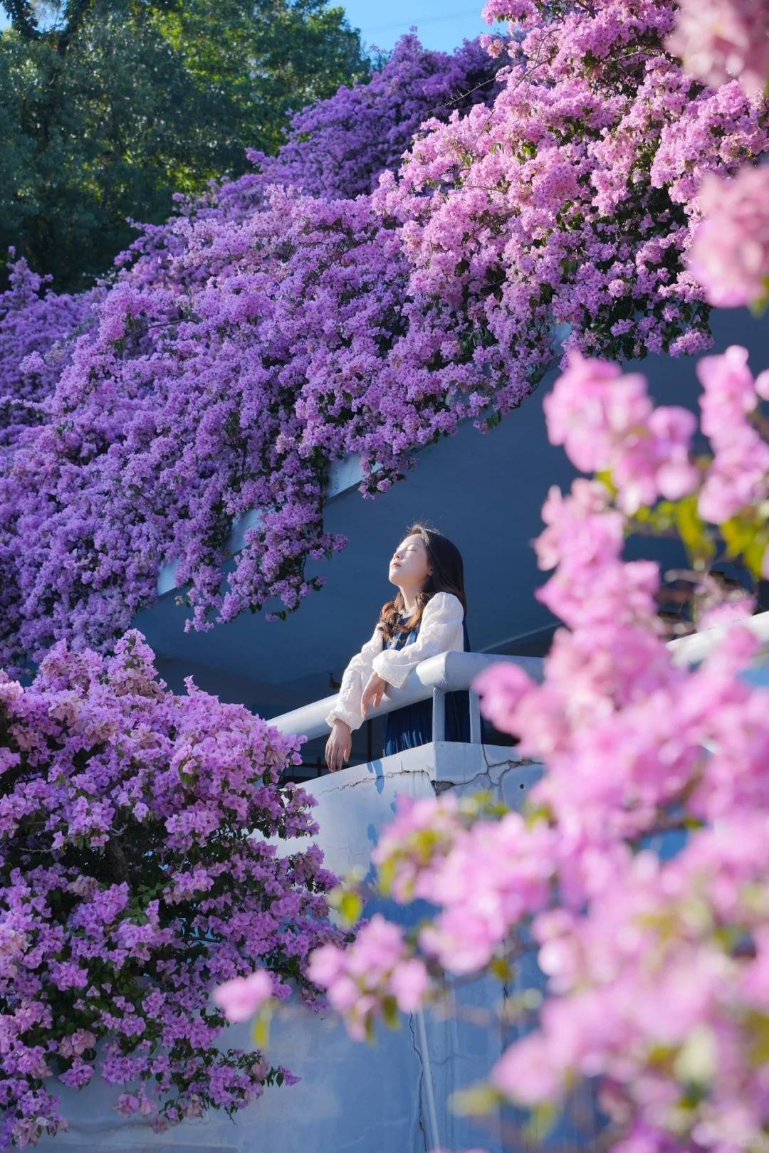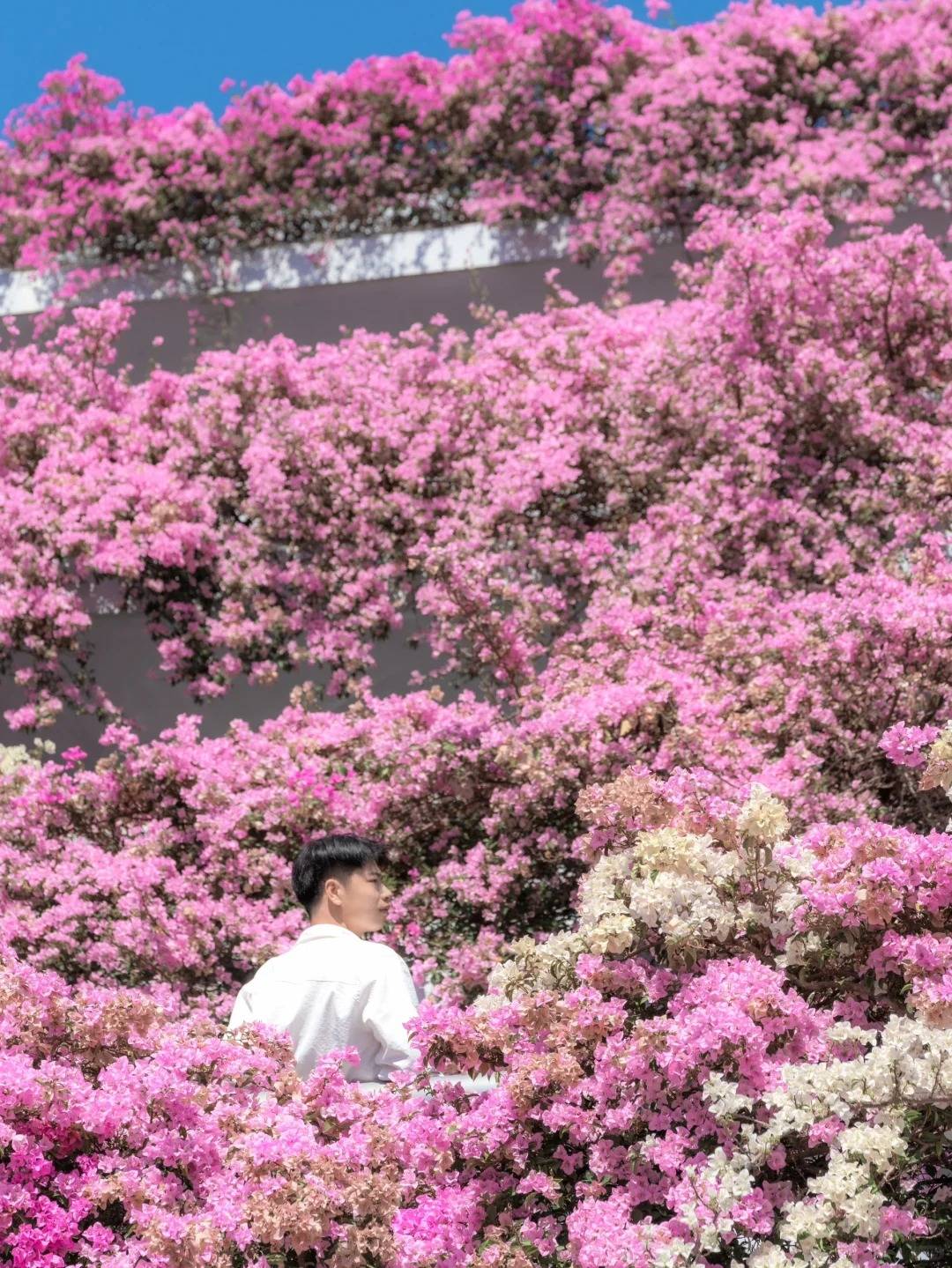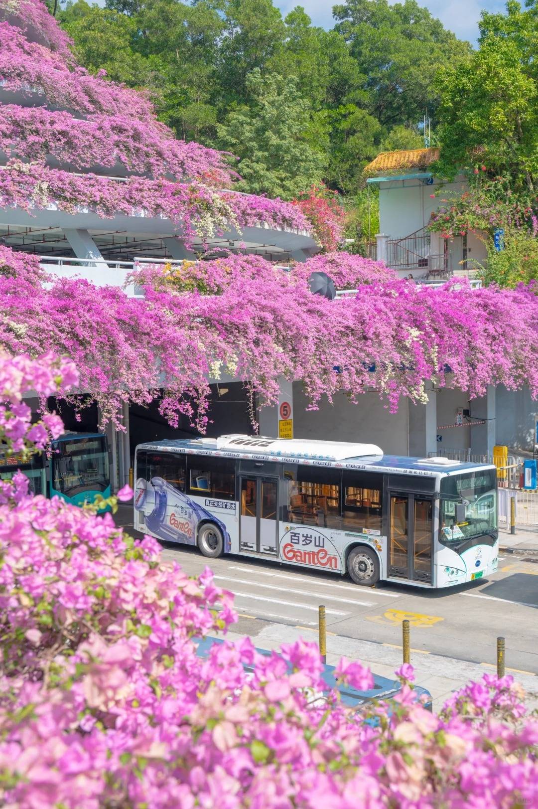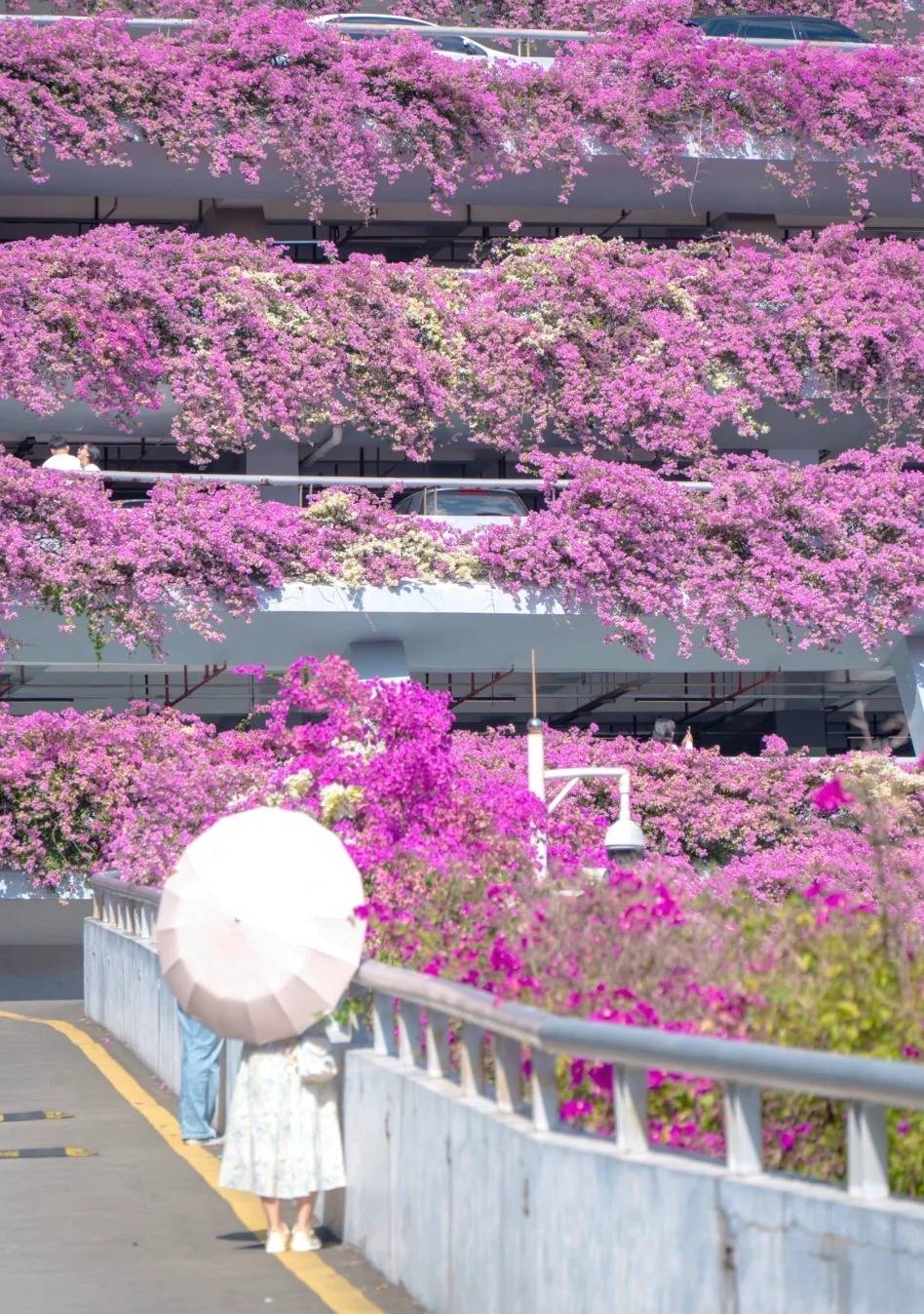 若你 10 月下旬或 11 月上旬來深圳賞花,停車場的三角梅正植盛放花期(花期至 11 月下旬),停車場一共 7 層,每層都種滿了三角梅,花期來,層層叠叠的三角梅花量甚大,點拍都美。遠拍,停車場造型地面的巴士,可以拍出日系電影感;近照,記得到一、二樓之間的行人步道,識得借下角度,可以拍出被花海包圍的畫面。