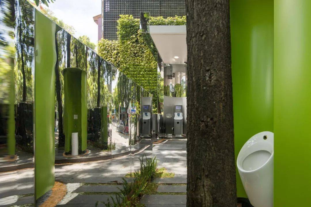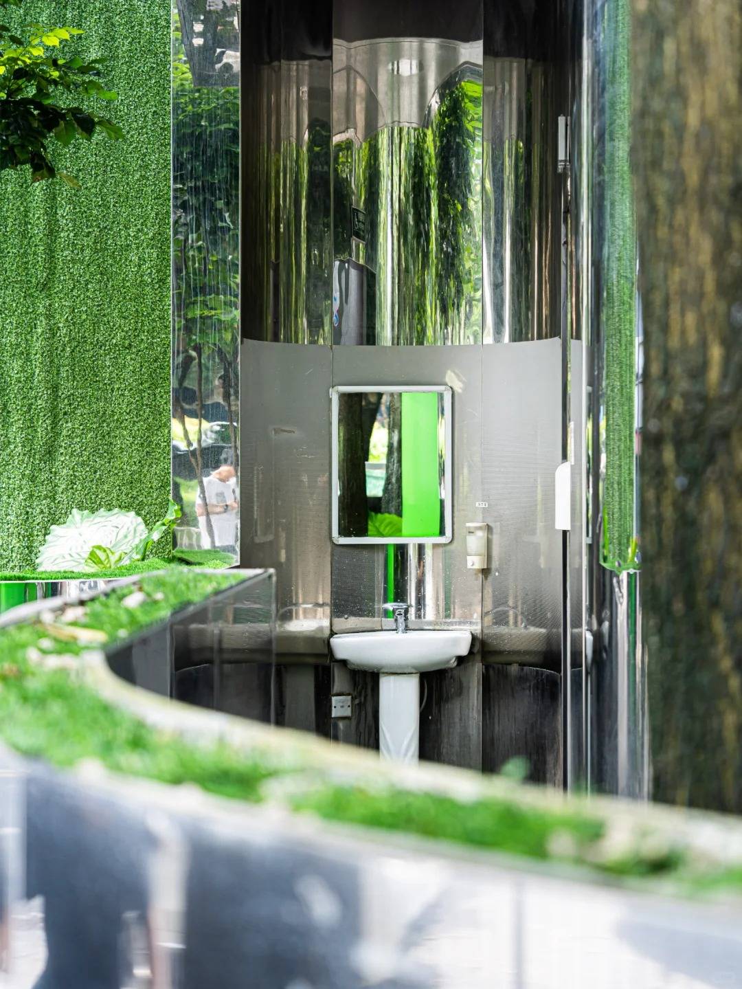 外觀設計非常有科幻感,以 8K 鏡面弧形不銹鋼裝飾,反映四周的樹林來融入環境,廁所頂部設有苔蘇與植物,廁所外有休憩椅,感覺良好,坐廁所外 hea 下心理上也不疙瘩。
