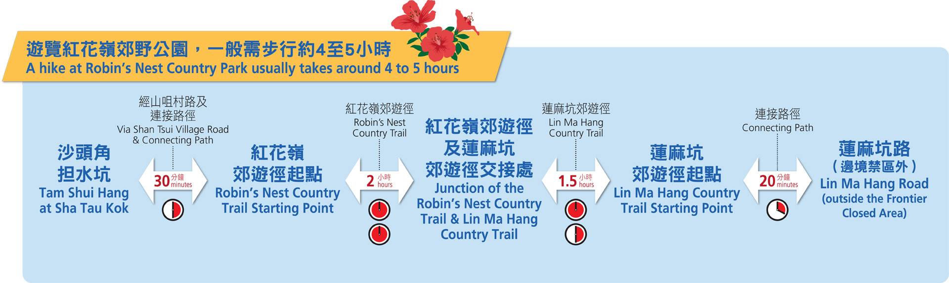 沙頭角担水坑 ➡ 山咀村 ➡ 紅花嶺郊遊徑起點 ➡ 二戰日軍軍事設施 ➡ 古蹟瞭望台 ➡ 梧桐山風景區 ➡ 紅花寨沙頭角海全景 ➡ 紅花嶺郊遊徑及蓮麻坑郊遊徑交接處 ➡ 蓮麻坑郊遊徑起點 ➡ 蓮麻坑鉛礦洞 ➡ 麥景陶碉堡 ➡ 蓮麻坑村 ➡ 蓮麻坑路(邊境禁區外)