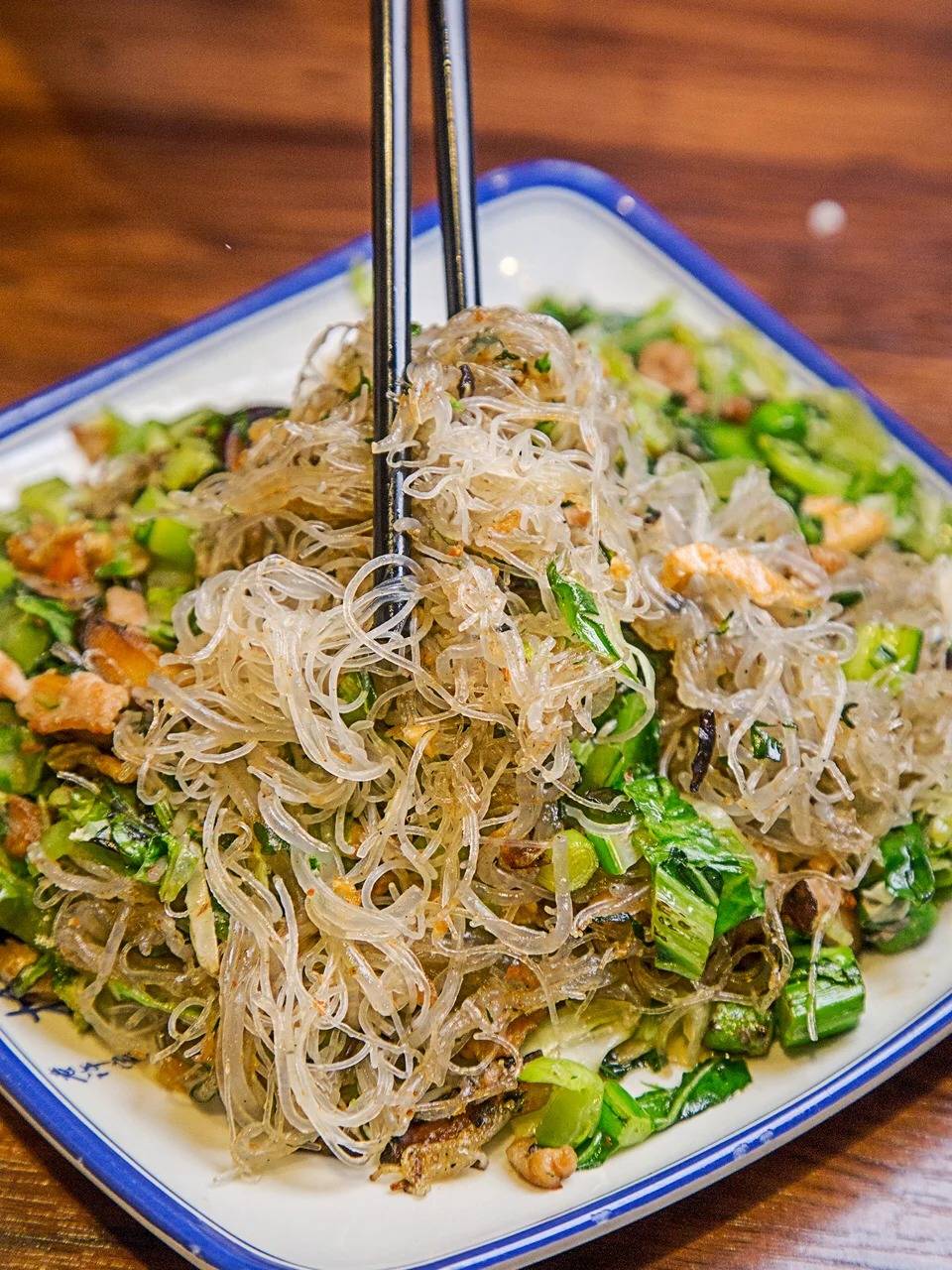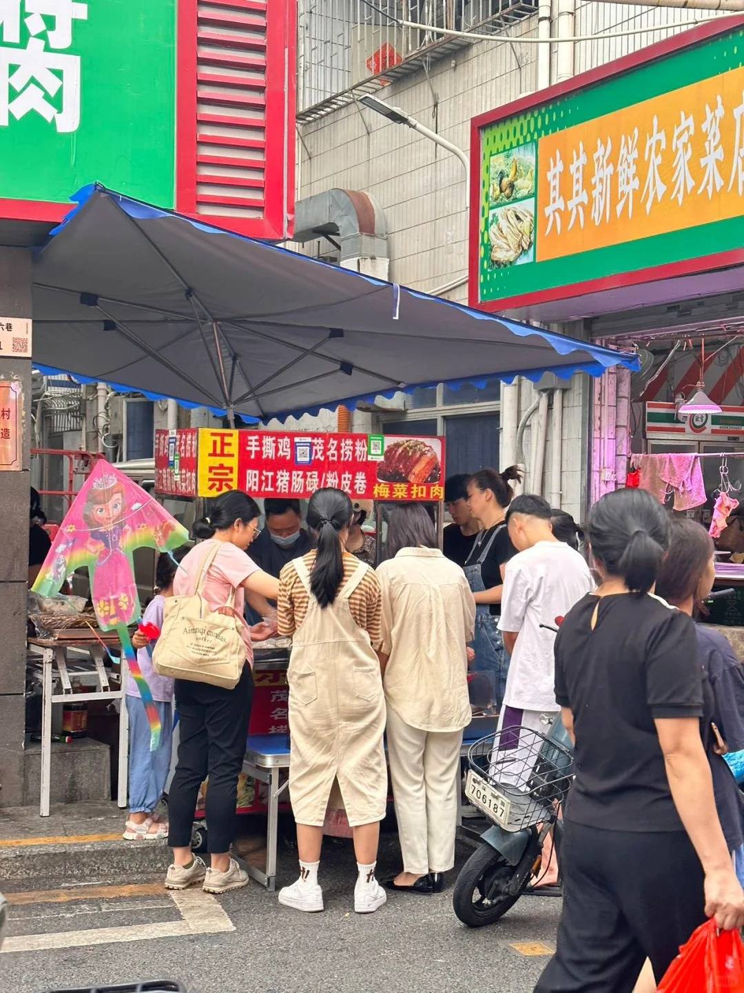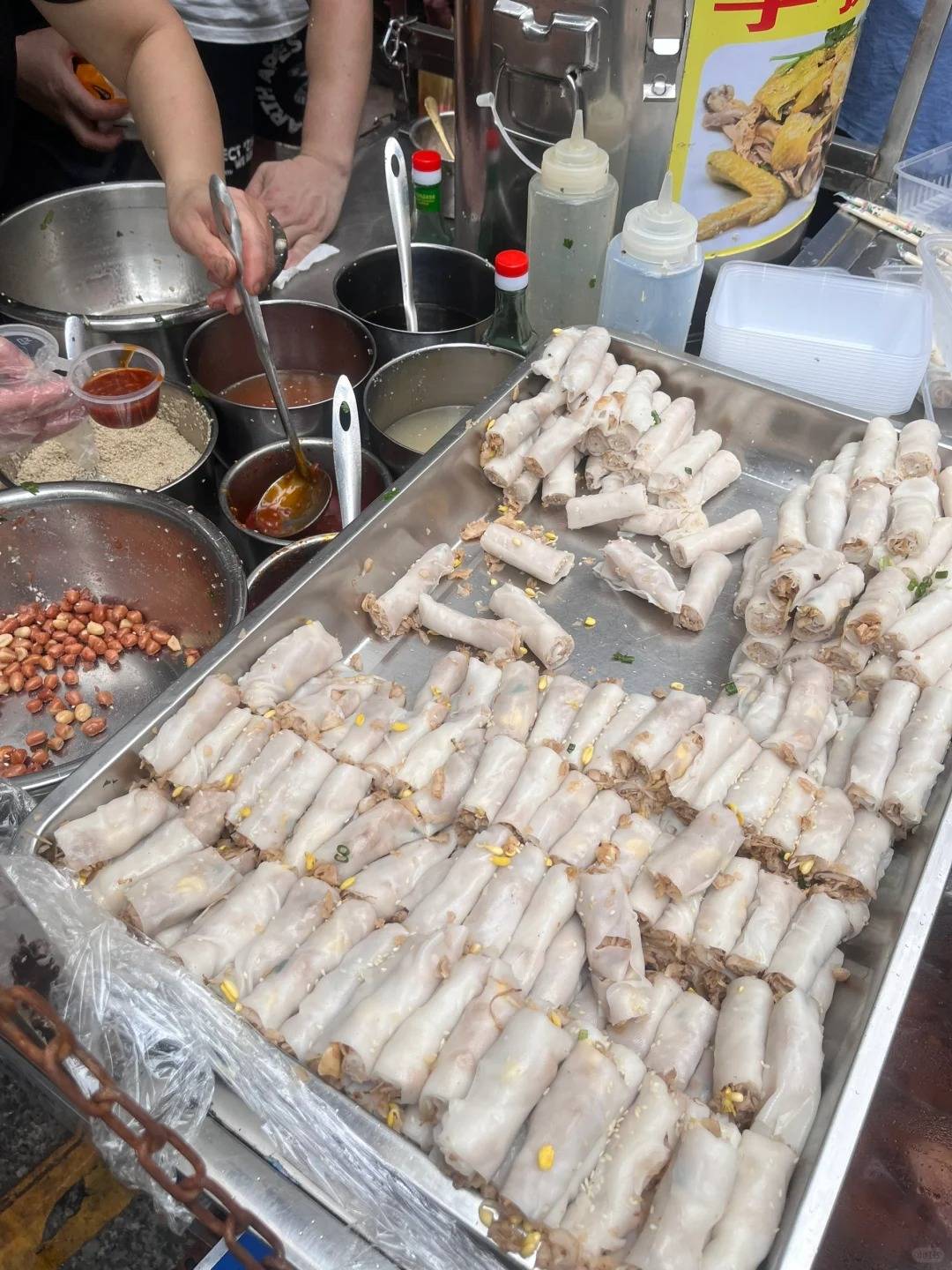 不少深圳人也衝着這款陽江地區的小食而來,不少更大呻未開舖已排長龍、未到中午已賣光、撲個空空。小攤連名字也沒有,在市場外見到綠色「增城客家豆腐」招牌就找到。以河粉皮捲着豆炒過的炒河粉及豆芽,煎香後加辣醬、肉汁及芝麻吃, ¥10 一碟、每碟 8 條。