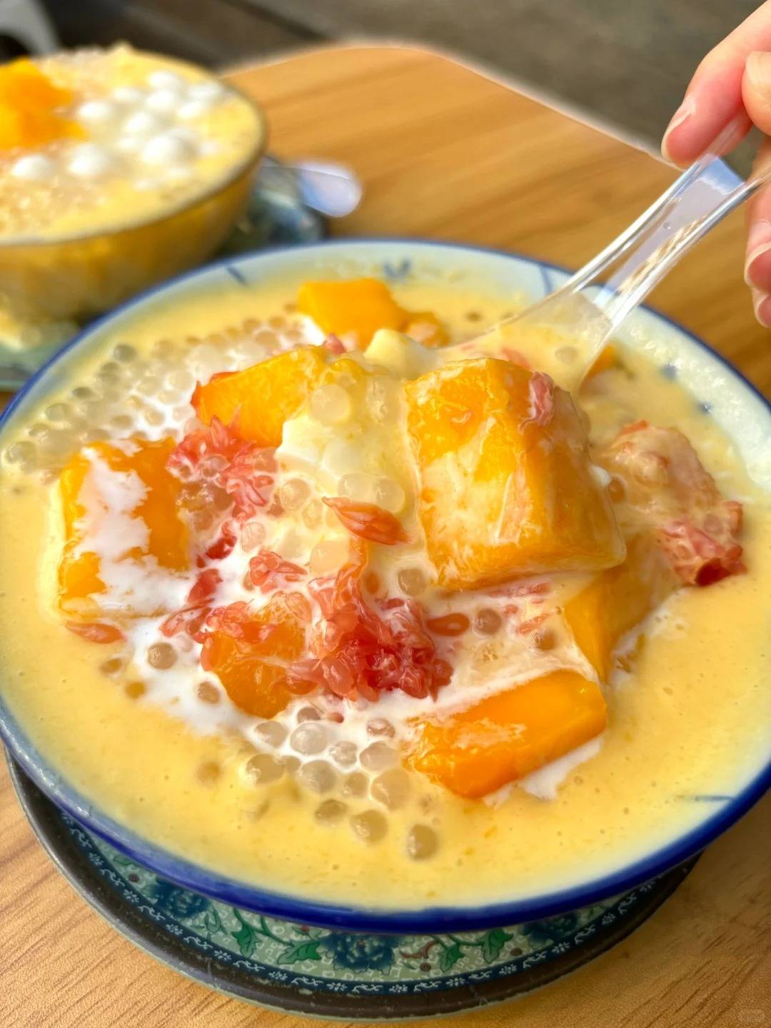 火紅原因是碗碗舀到差不多滿瀉的糖水。必食是「多芒系列」,如楊枝甘露、芋圓多芒小丸子等,芒果切得大大粒,價錢只是 ¥18,以這樣的份量,完全無投訴。芋泥甜品也是備受好評的,芋泥煮很絲滑無顆粒感,入口即化,配口感嫩滑的雙皮奶,口感統一。