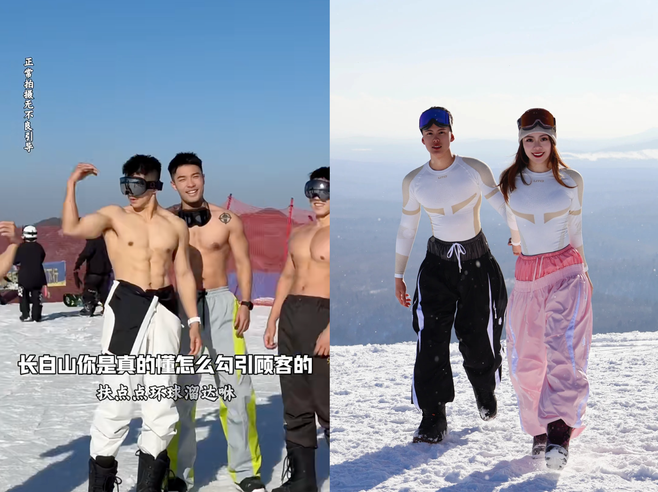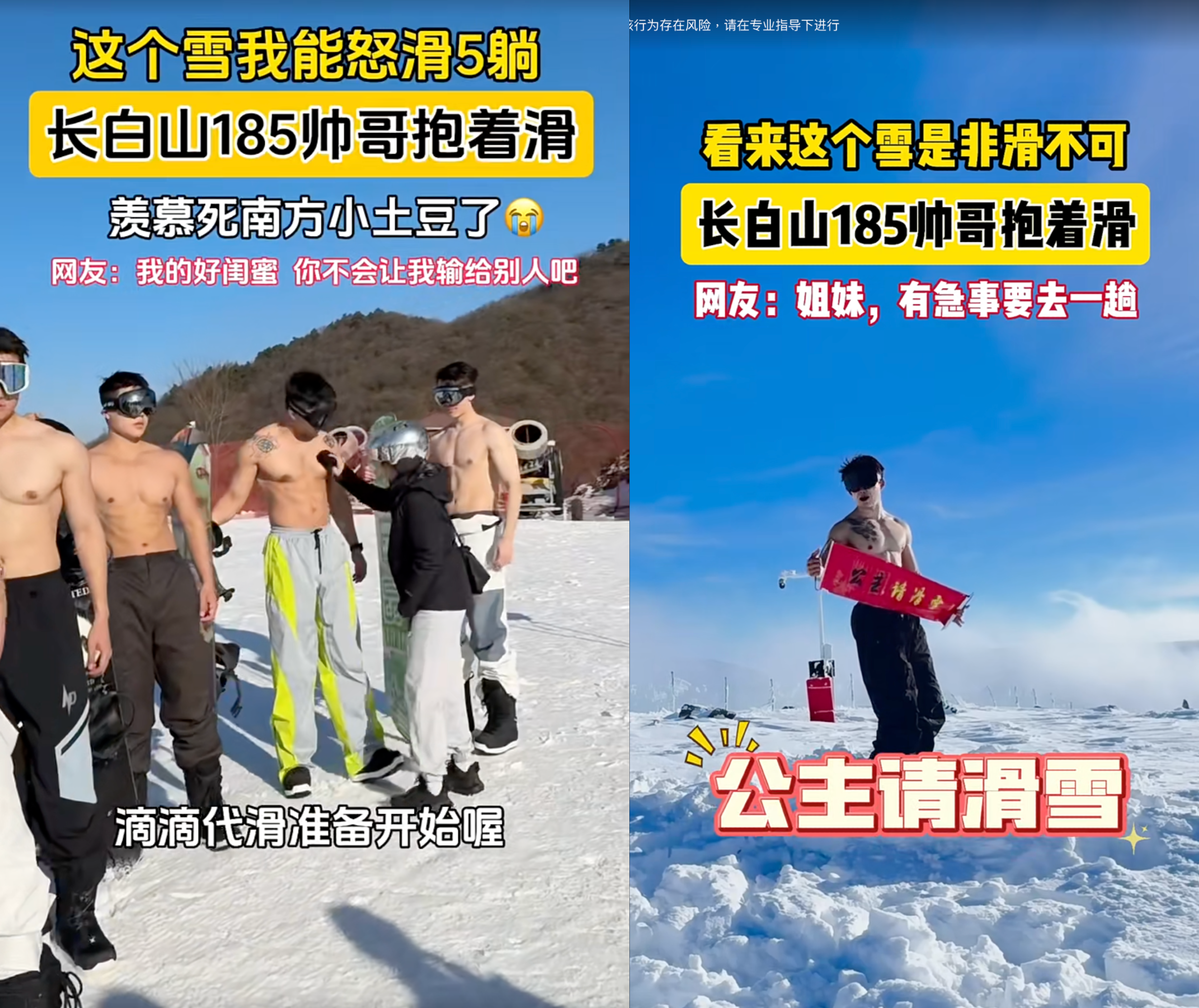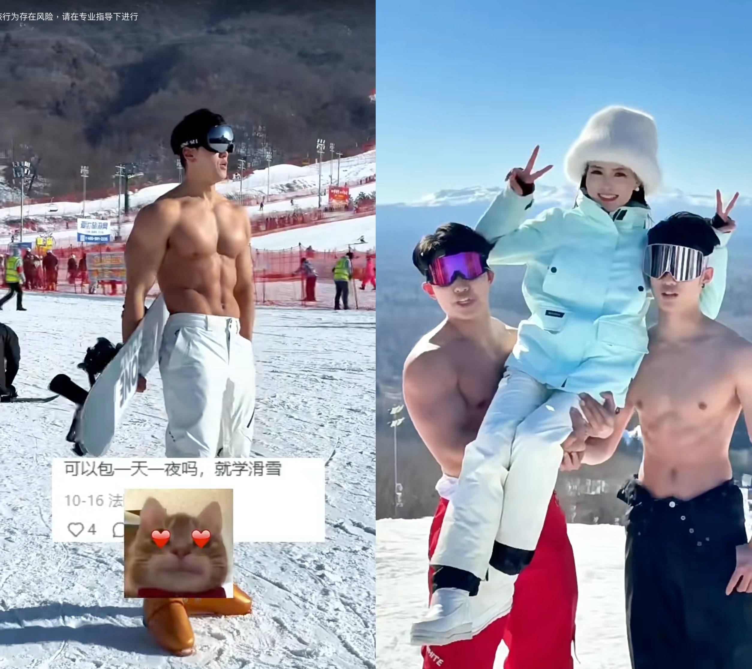 小紅書上有不少「滴滴代滑」、「公主請滑雪」的影片,在白茫茫的雪地上,一排祼着上半身的 185cm 高、42 吋巨胸師哥格外顯眼,不少女士都忍唔住伸手摸摸巨胸。帥哥還不止賣樣、賣「波地」,滑雪技術也很高超,不少是體大學生、也有在山上長大的愛斯基摩人,面對一眾公主,能使出 X 款抱抱花招,把一眾女士寵成雪國公主。