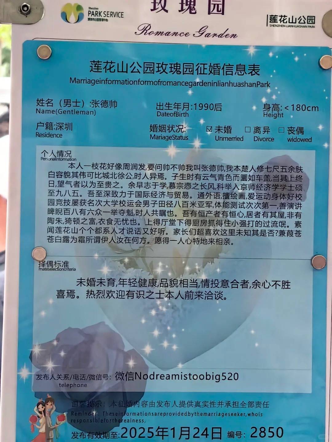 大家更可放心,公園有保安人員每天巡邏,確保相親掛牌完好,又會定期查核掛牌上的資料,同時禁絕有人私自張貼求偶啟示,難怪心急的深圳家長如此湧躍。