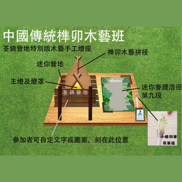 用木材預製組件,在導師指導下以中國傳統榫卯方式,組裝一盞迷你營地燈座,配備了小型記事本、迷你盆栽筆及一組乾電池供電部分。仲可以刻埋字或圖,不但可以拎返屋企做氣氛燈,下次露營仲可以為全新裝備。