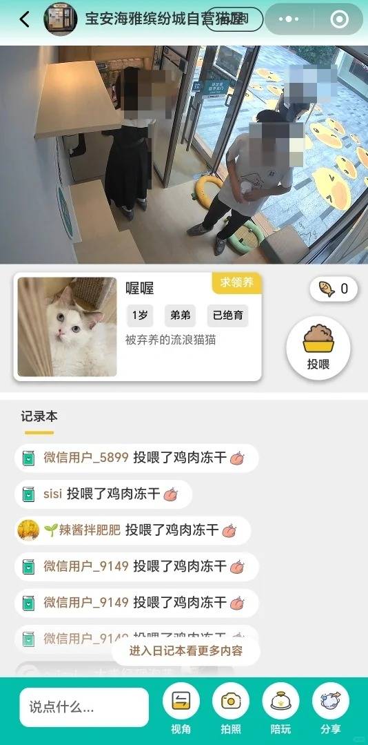 1️⃣預約擼貓:想領養的話,可以在 app 裏預約到智能站與貓貓互動,掃碼付 ¥9.9 半小時(也用於照顧貓貓的費用)。有值班人員遠程開門,每次最多容納 3 人(兒童須家長陪同)