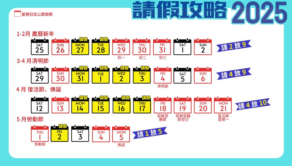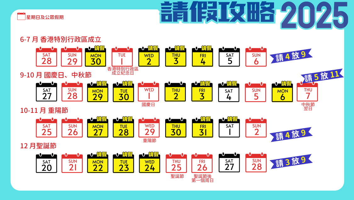 政府不久前公布咗 2025 公眾假期,下年一共有 17 日,醒目打工仔必定把握「假膽」自製長假期外遊,今年的假期分布都唔錯,農曆年、清明、復活節、香港特區成立紀含日、國慶及中秋、重陽節及聖誕節,都可以做到請幾日假自製長假期,當中以農曆年最筍,請 2 放 9,而國慶及中秋以及復活節等,都可以做到請 5 放 11、請 4 放 9 的長假。即刻睇下邊截假期你攞假最有利。