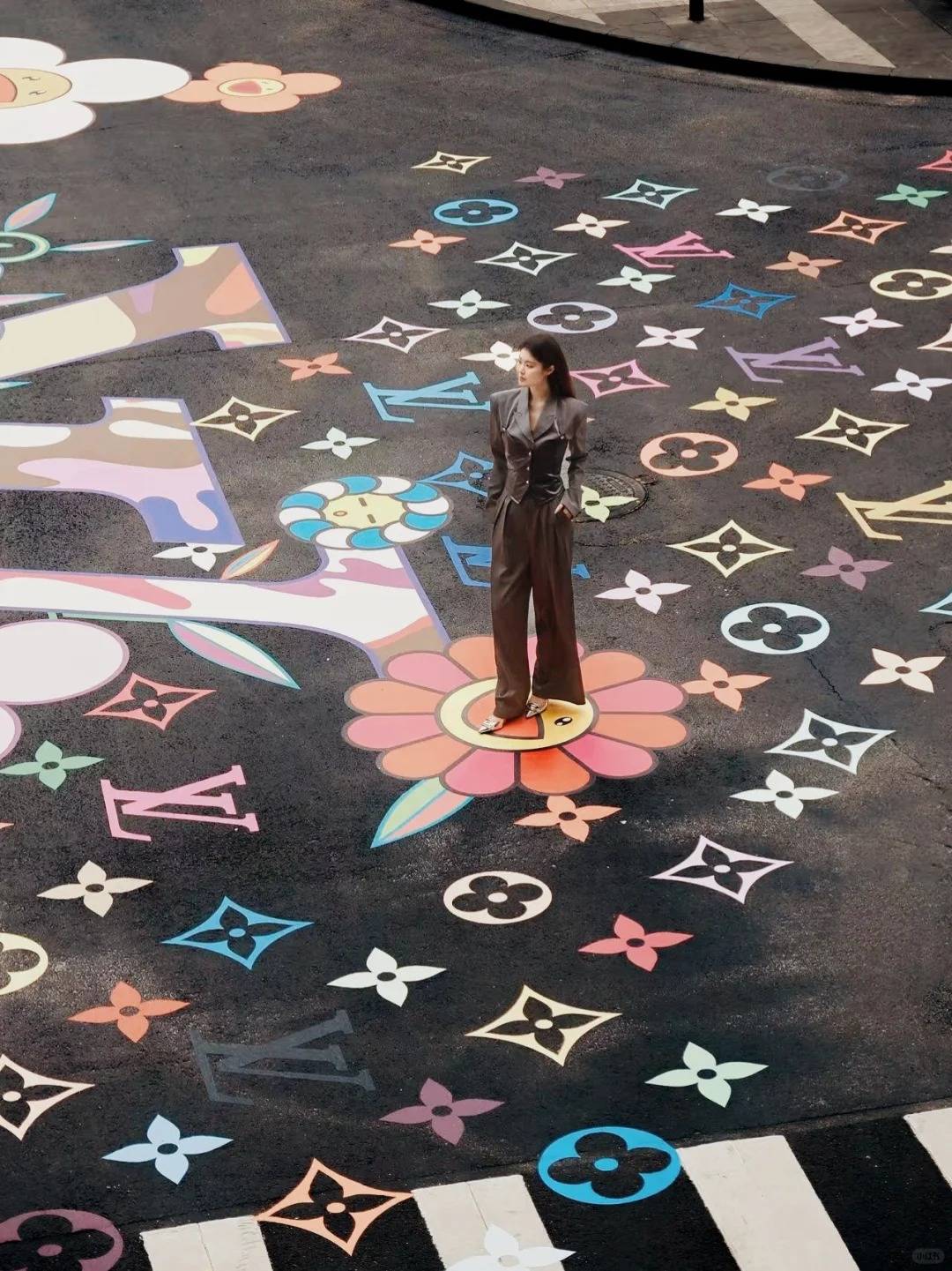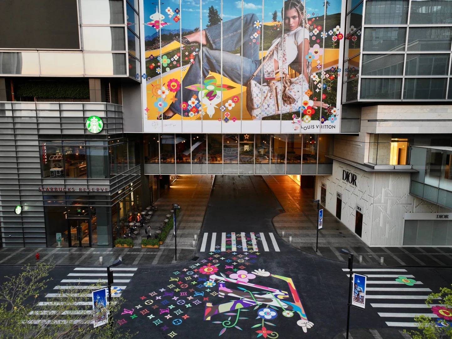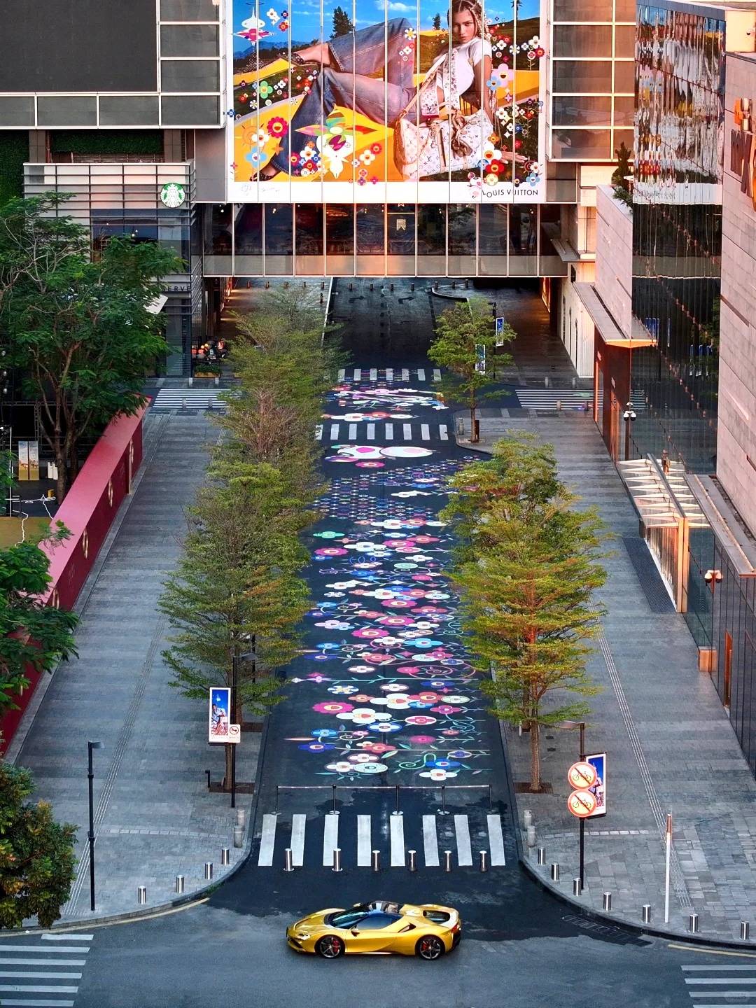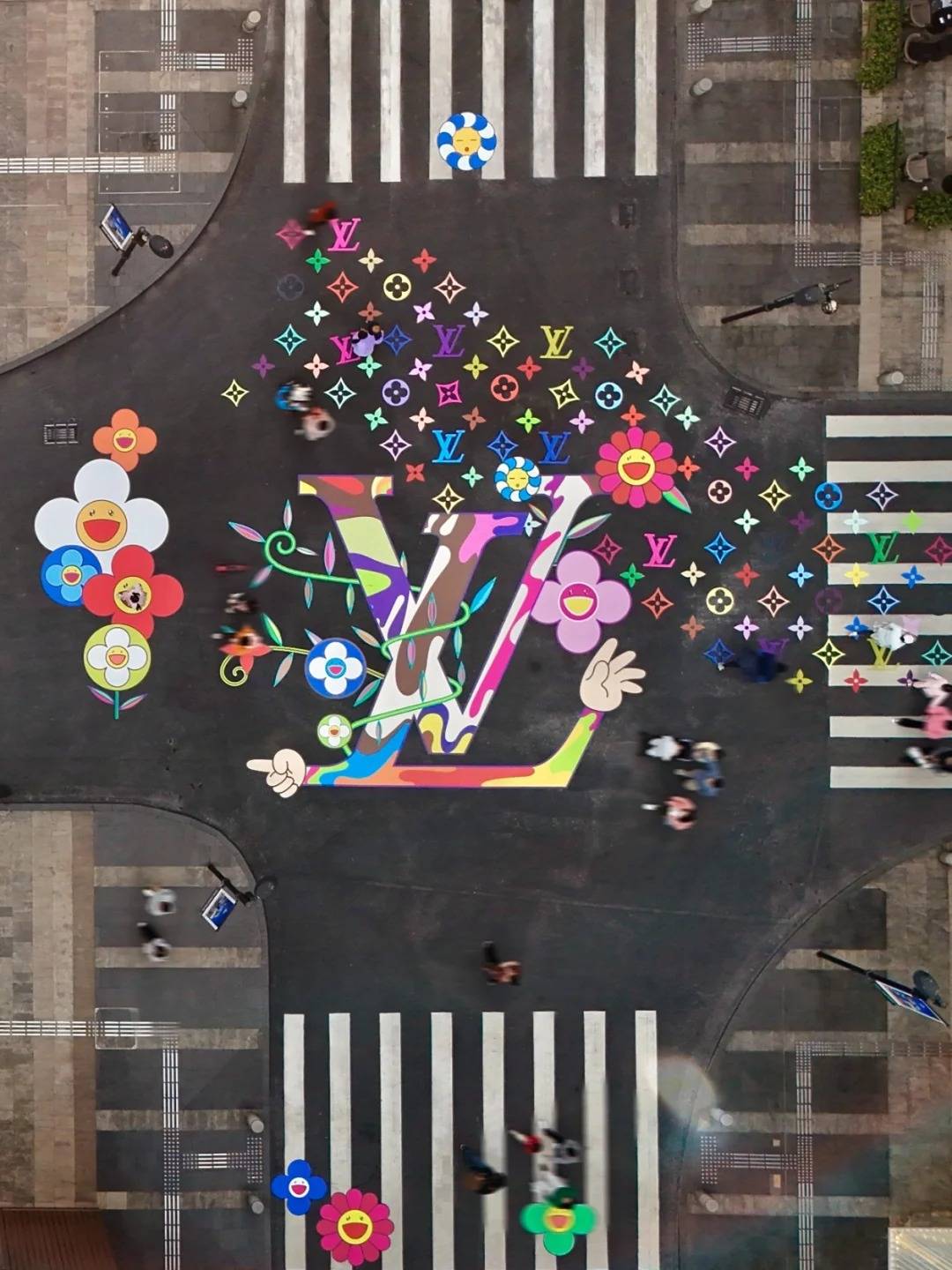 這個聯乘特別為 Louis Vuitton × Murakami 20 周年而設,整條大道地下都佈滿村上隆招牌的太陽花圖案及一隻巨型的 Superflat Panda, 十字路口交界位置則有巨型 LV 及彩虹 Monogram 圖案。花街旁邊還有今年商場為農曆新年而設的「靈蛇瑞園」(詳情待官方公布),鮮紅色的牆壁配上村上隆太陽花型的窗框,啱晒新年。