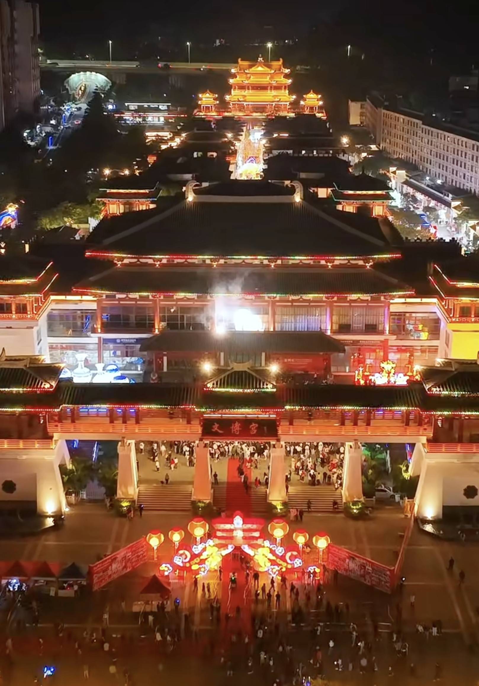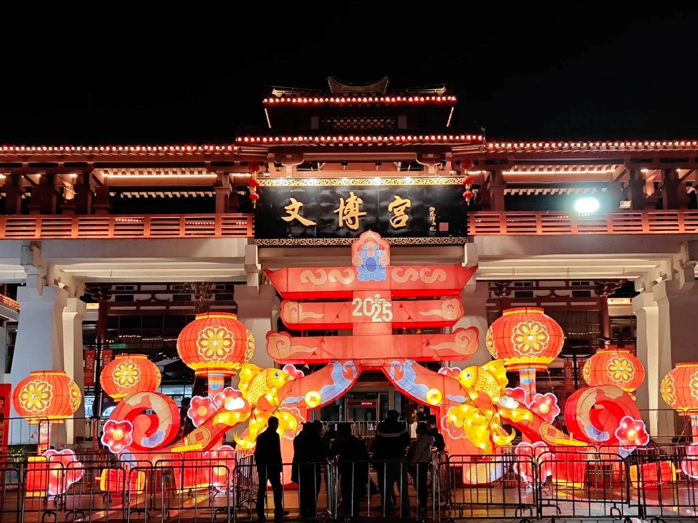 景點文博宮是仿古集群式建築群,秦、漢、唐、宋、元、明、清七個朝代的宮廷建築風格,在這裏過年十分有氣氛。2025 年的燈會以「華燈旖夢·山海奇觀」為主題,花燈會面積達 30000 平方米,設置了 30 組巨型花燈組,包括神話角色「九色」、鹿狐、仙鵝、高山流水、青花瓷、十二生肖及熊貓等。