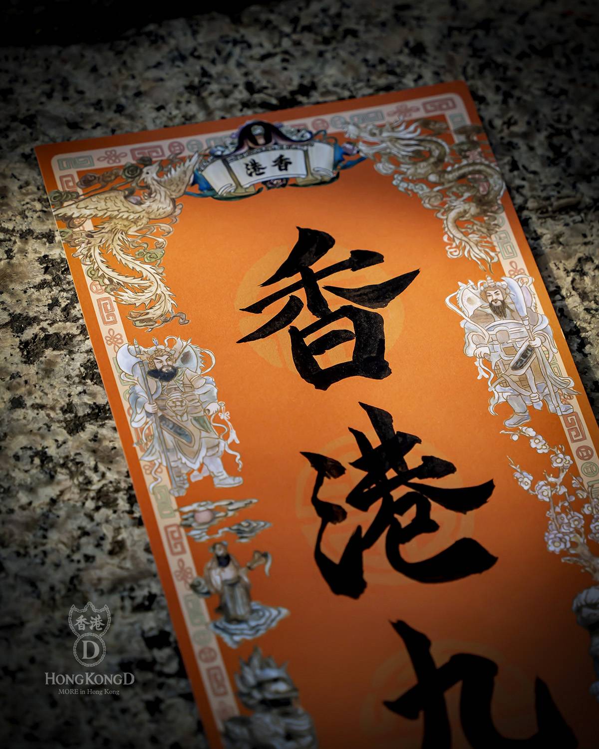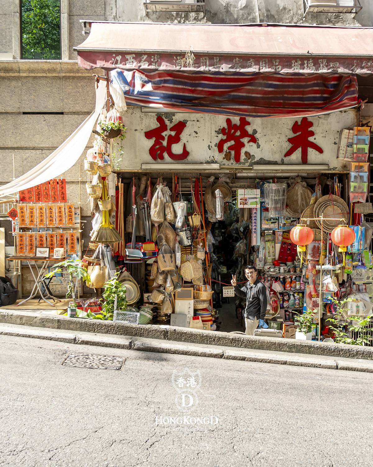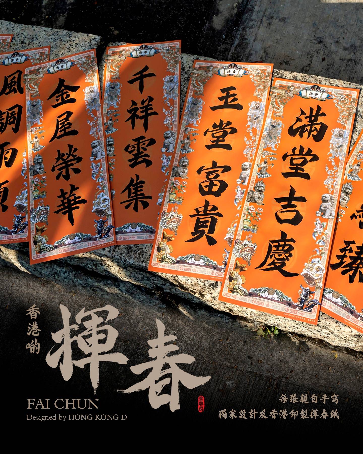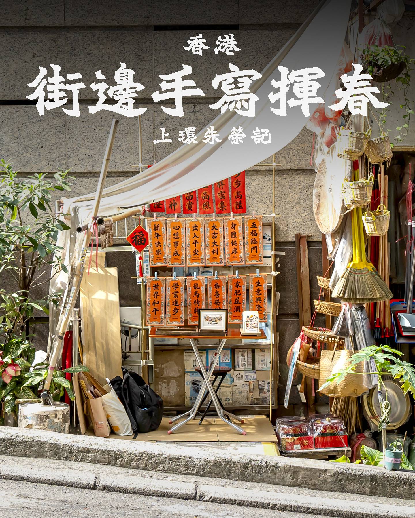 香港旅遊文化平台 Hong Kong D 與 1959 年開業的上環老字號山貨店朱榮記合作,在舖頭門外設置揮春攤檔。檔口 Hong Kong D 的創辦人阿金主理,揮春紙張特別,並非傳統的紅紙,而是用上桔紅,旁邊還有由他設計的吉祥圖案。