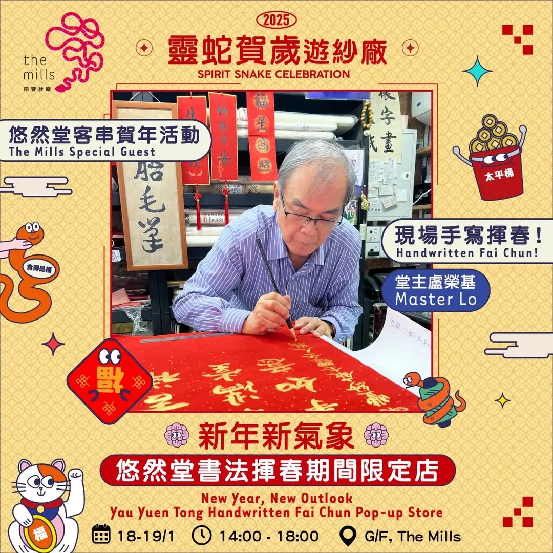 荃灣的街坊一定識得位於大河道的悠然堂,這間在荃灣 58 年的文房四寶店,堂主盧榮基每年都會為街坊揮毫寫揮春對聯,但去年 3 月光榮結業,每年都找盧師傅寫揮春、開市啟示的老街坊也不知怎算。今年南豐紗廠請來盧師傅客串、開期間限定揮春店,為大家想要一對有手寫溫度的賀年揮春或對聯,只限本周末 2 天,不要錯過啊!