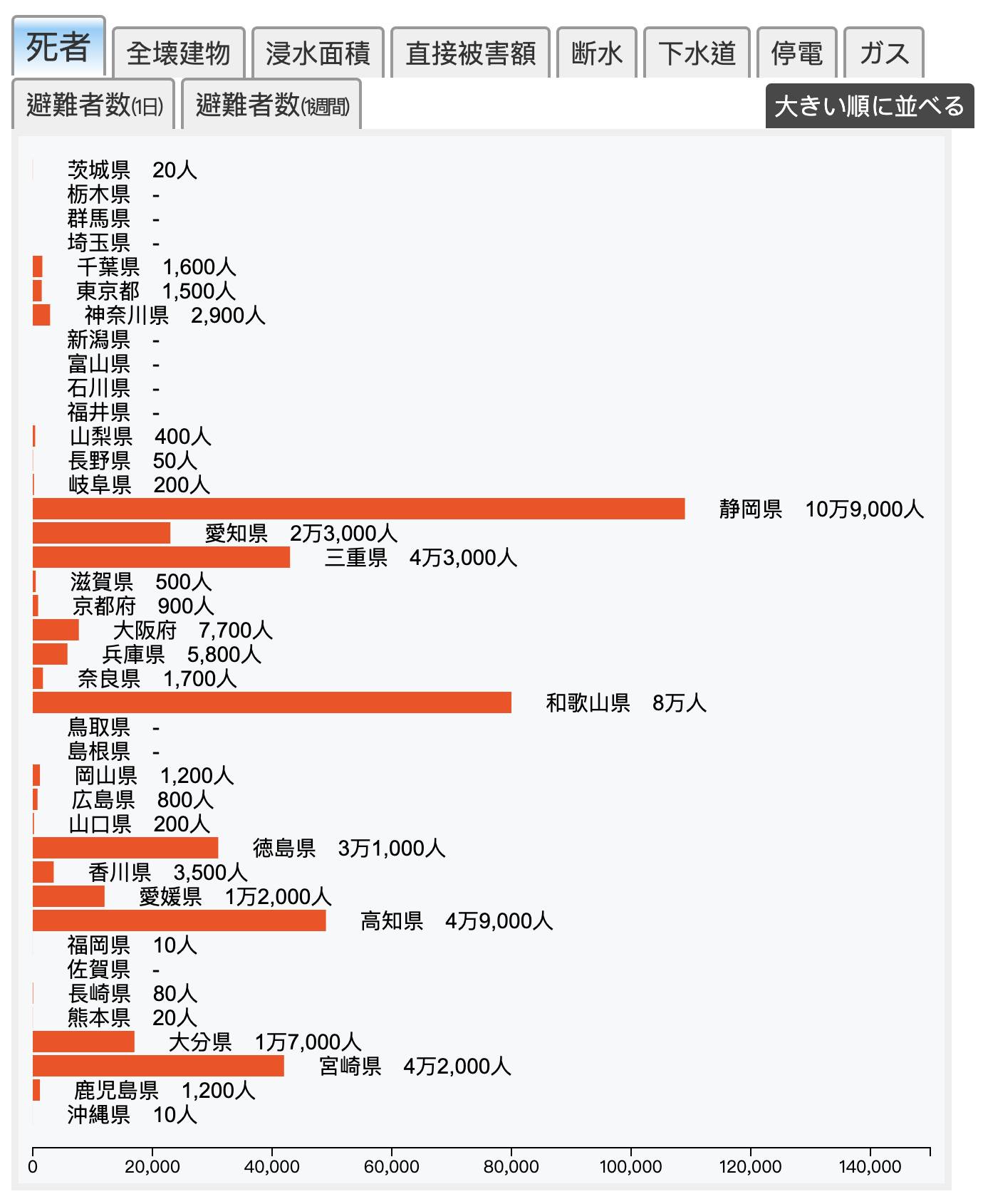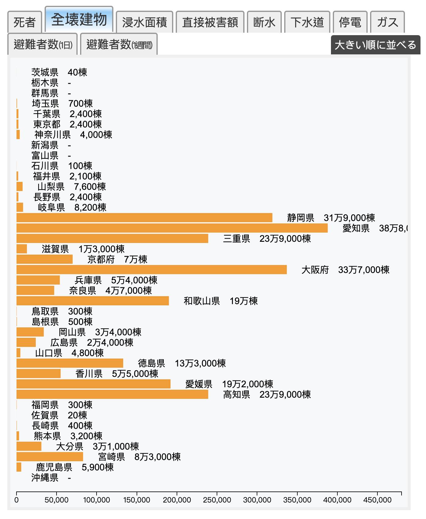 根據《朝日新聞》南海海槽地震假設,以下是 10 個「全壞建物收量」及「死亡人數」程度最嚴重的都道府縣。