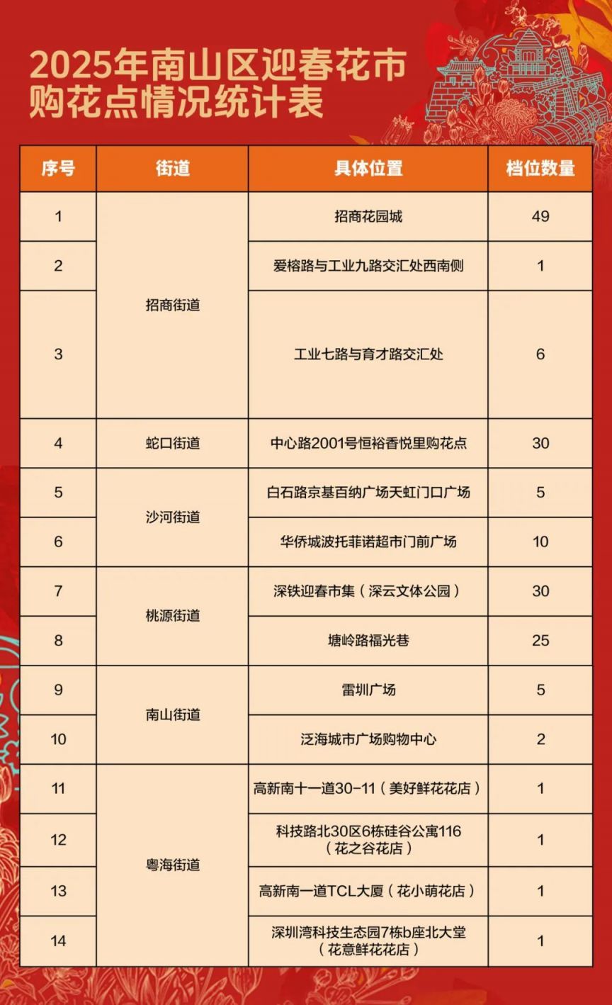 臨近農曆年,深圳的迎春花市都開鑼,當中一個非常大型的,是「南山區迎春花市」,活動覆蓋荷蘭花卉小鎮、中山公園、南頭古城及多個公園及商圈,共160個年花攤檔橫跨南山區12個街區,花市期間還還有舞龍表演、音樂演出、傳統民俗活動、簪花集市和文創手作等項目。現已開幕,展期至2月12日,更設有2條免費巴士線接載遊客前往花市多個地點。