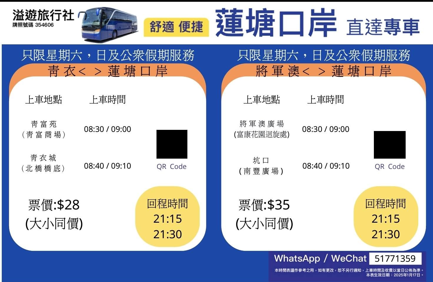蓮塘快線由溢遊旅行社開設,每個地點每日來回設 4 班車,設有將軍澳及青衣2個上車點。
