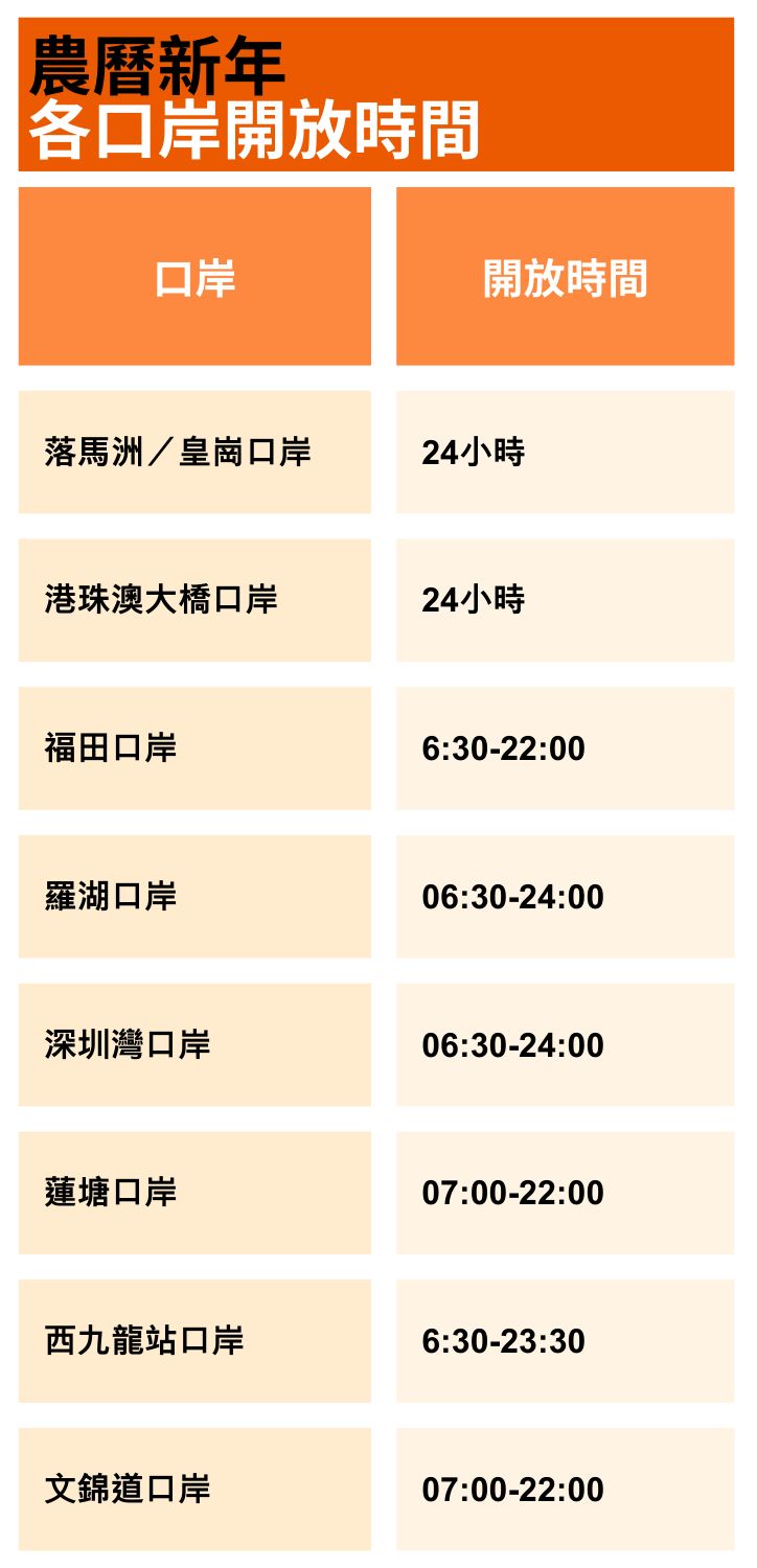 農曆新年公眾假期由本周三(1月29日)開始,連續三日公眾假期加上周末,五連假北上港人應該不少,年廿九(1月28日)更會是港人北上的頂峰,有北上深圳玩樂打算的港人應該會關注香港8個口岸的開放時間,農曆新年各大關口開放時間維持不變,大家北上過關可以參考以下資料。皇崗口岸|0:00-24:00,如常 24 小時通關。羅湖口岸|6:30-24:00,維持平日的通關時間,不會延長。