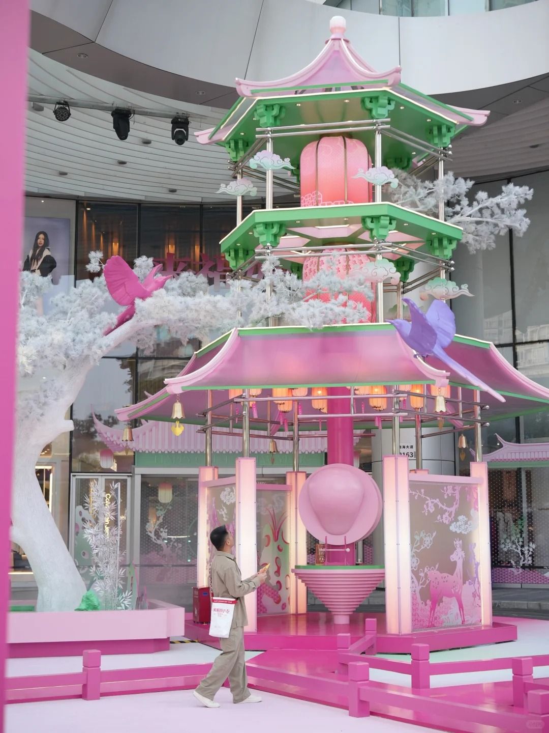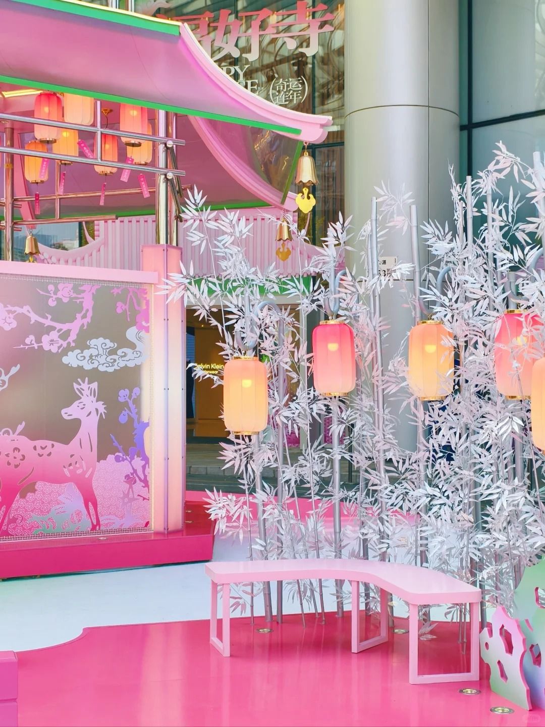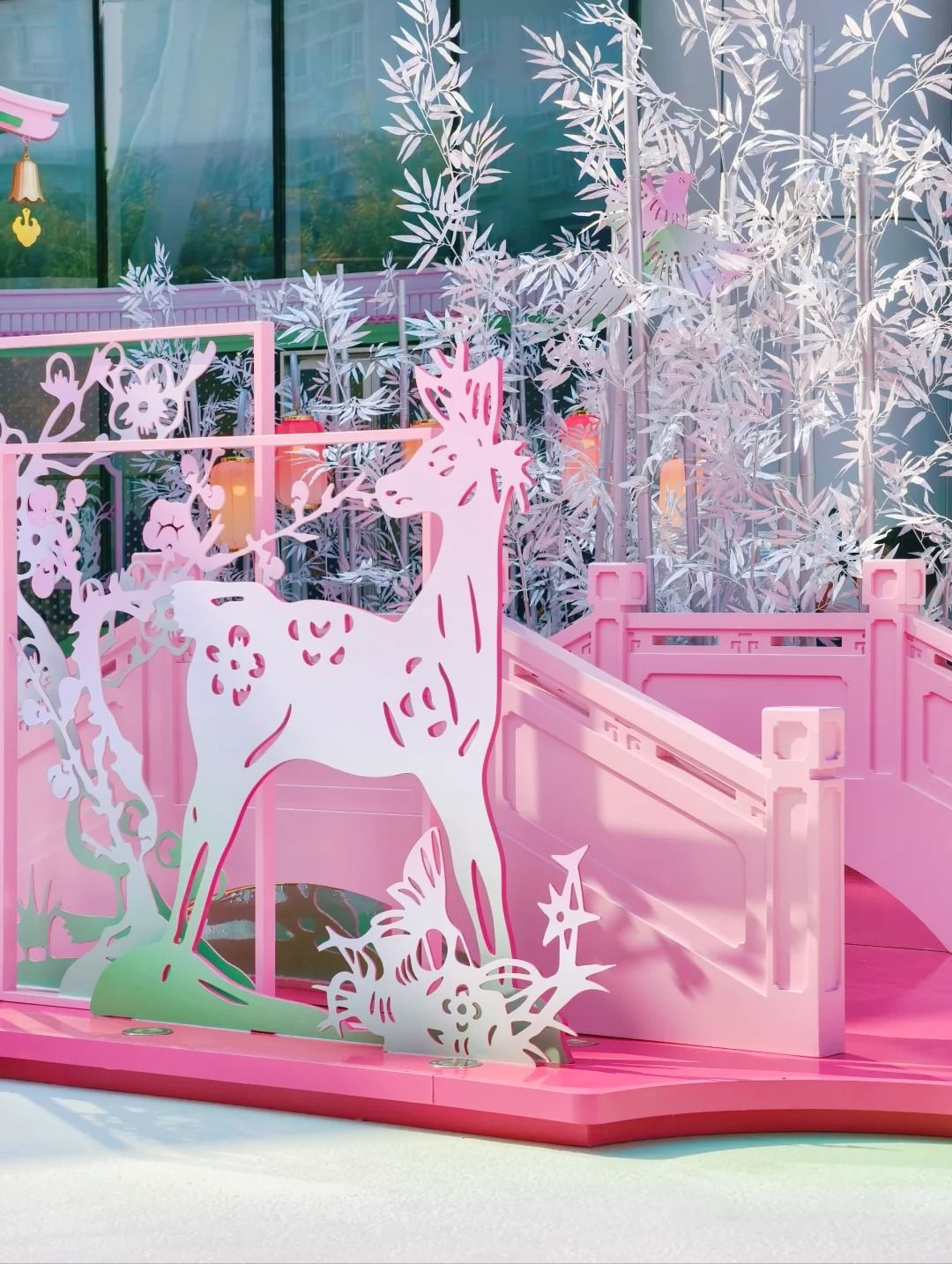 寺旁邊有一個粉紅中式橋打卡位,綴以銀竹及梅花鹿。