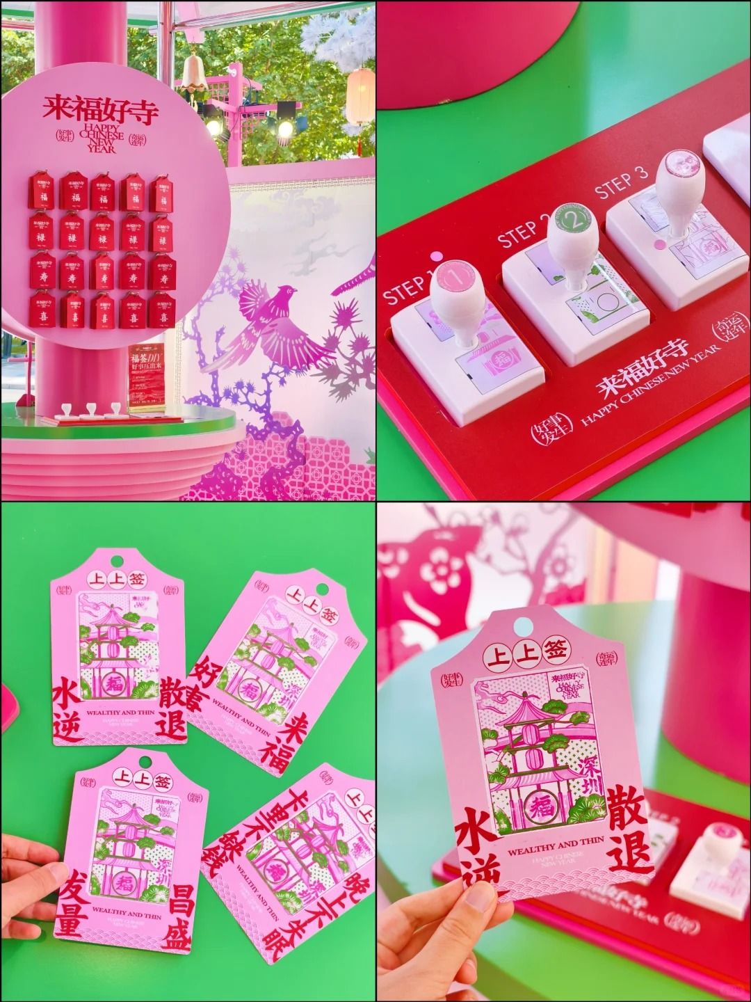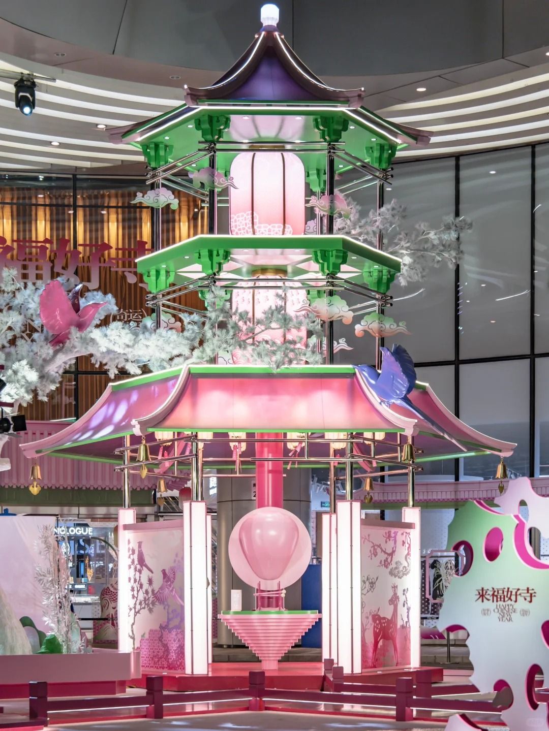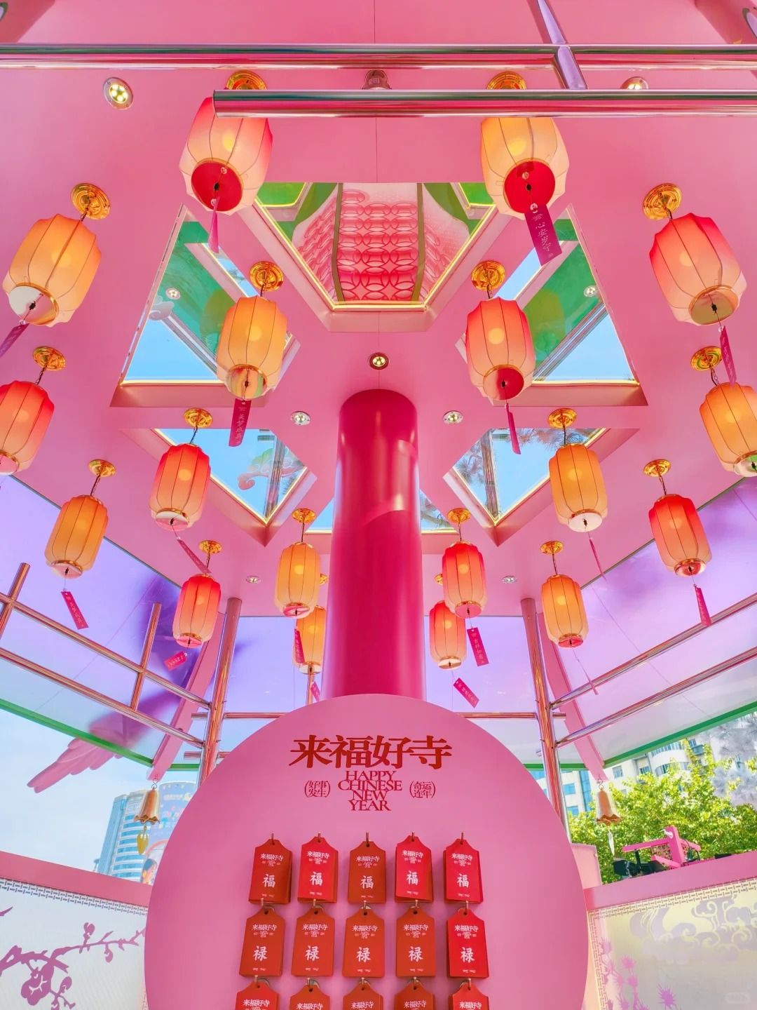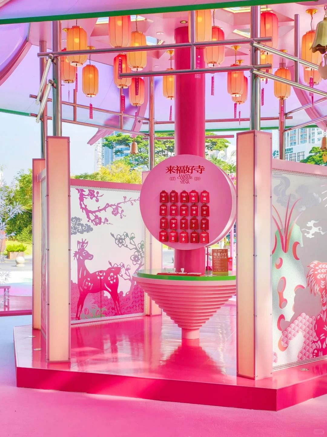 近三層高的許願寺「來福好寺」,以古代花燈作為設計概念,飾以梅花及祥雲。「寺」內設有燈籠、許願板及巨型粉色木魚。