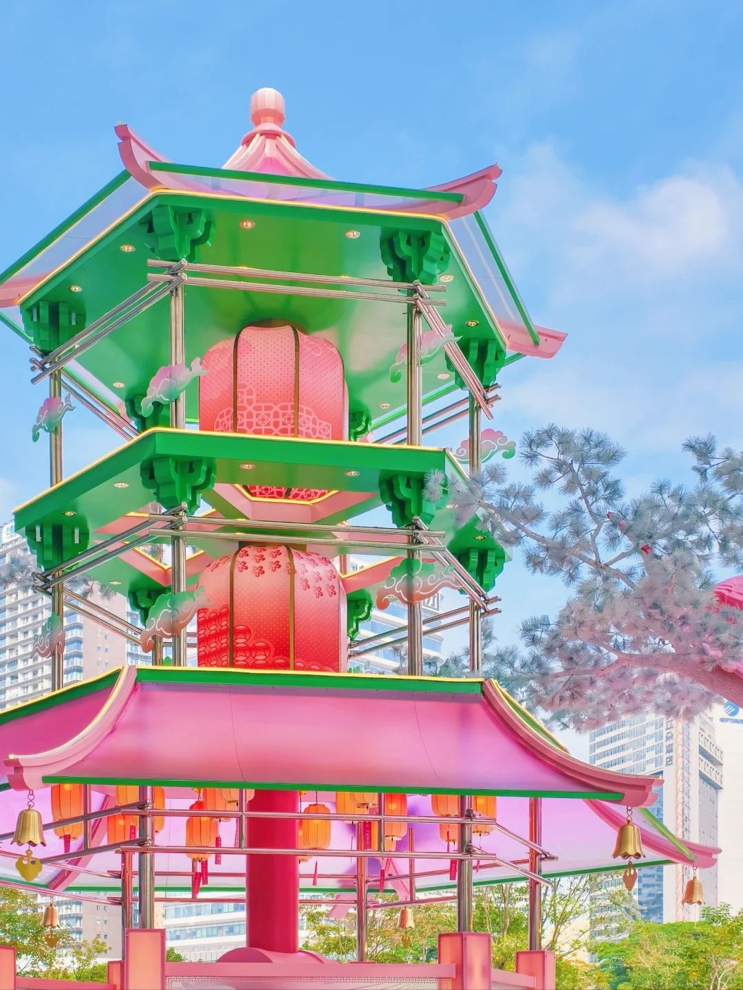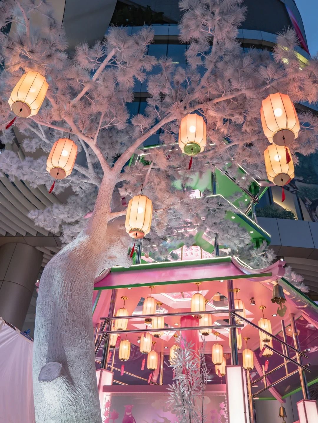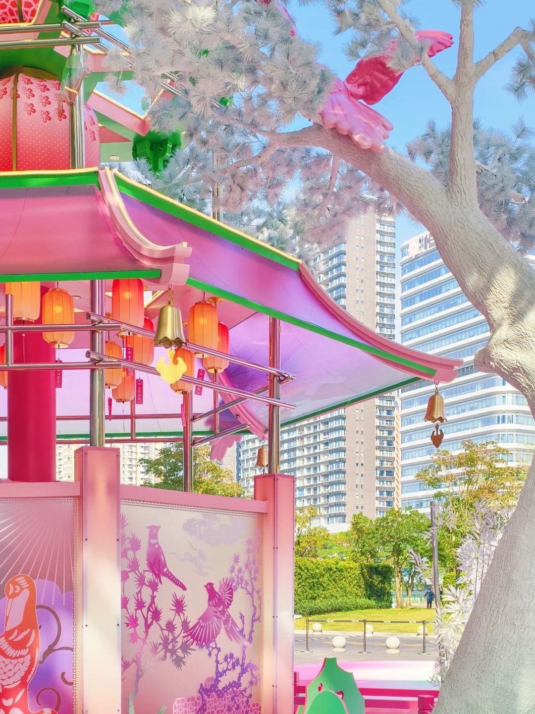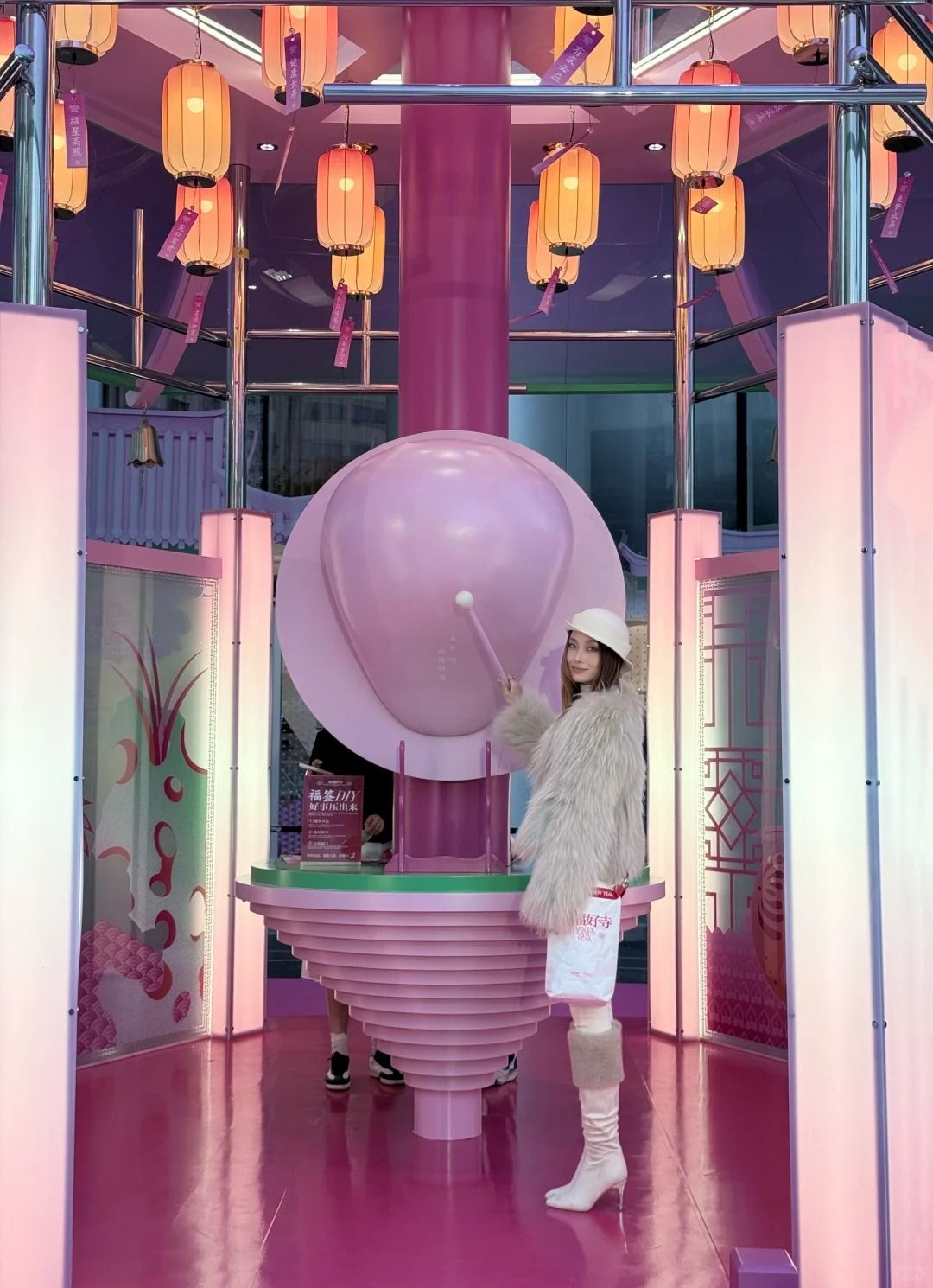 近三層高的許願寺「來福好寺」,以古代花燈作為設計概念,飾以梅花及祥雲。「寺」內設有燈籠、許願板及巨型粉色木魚。