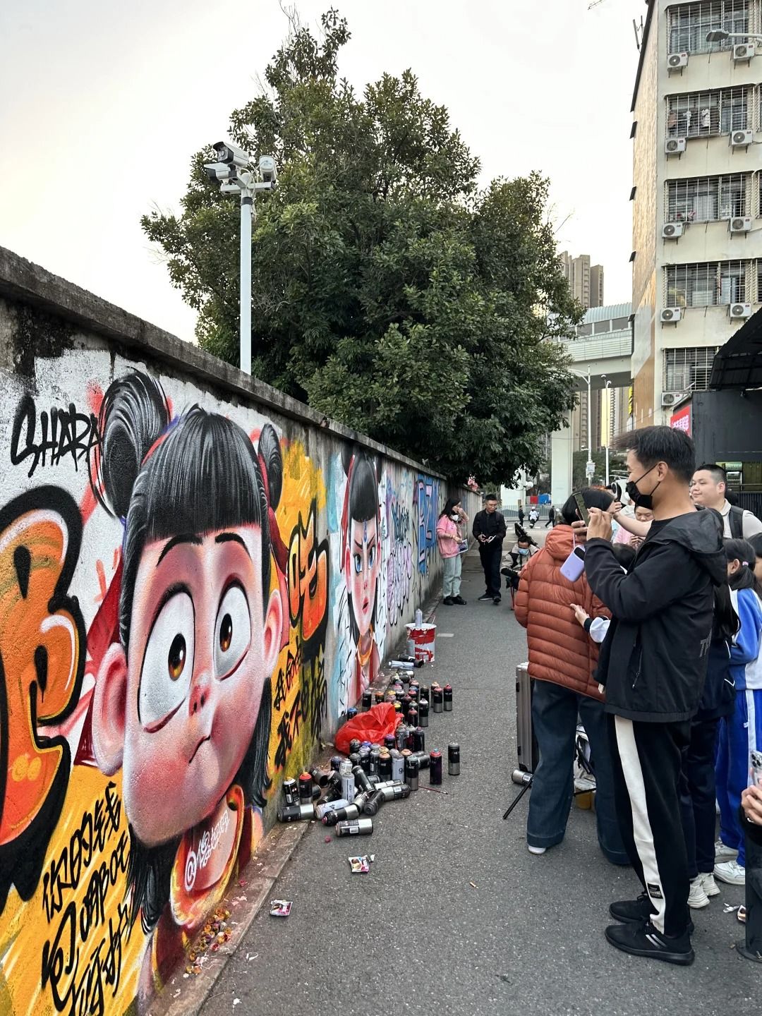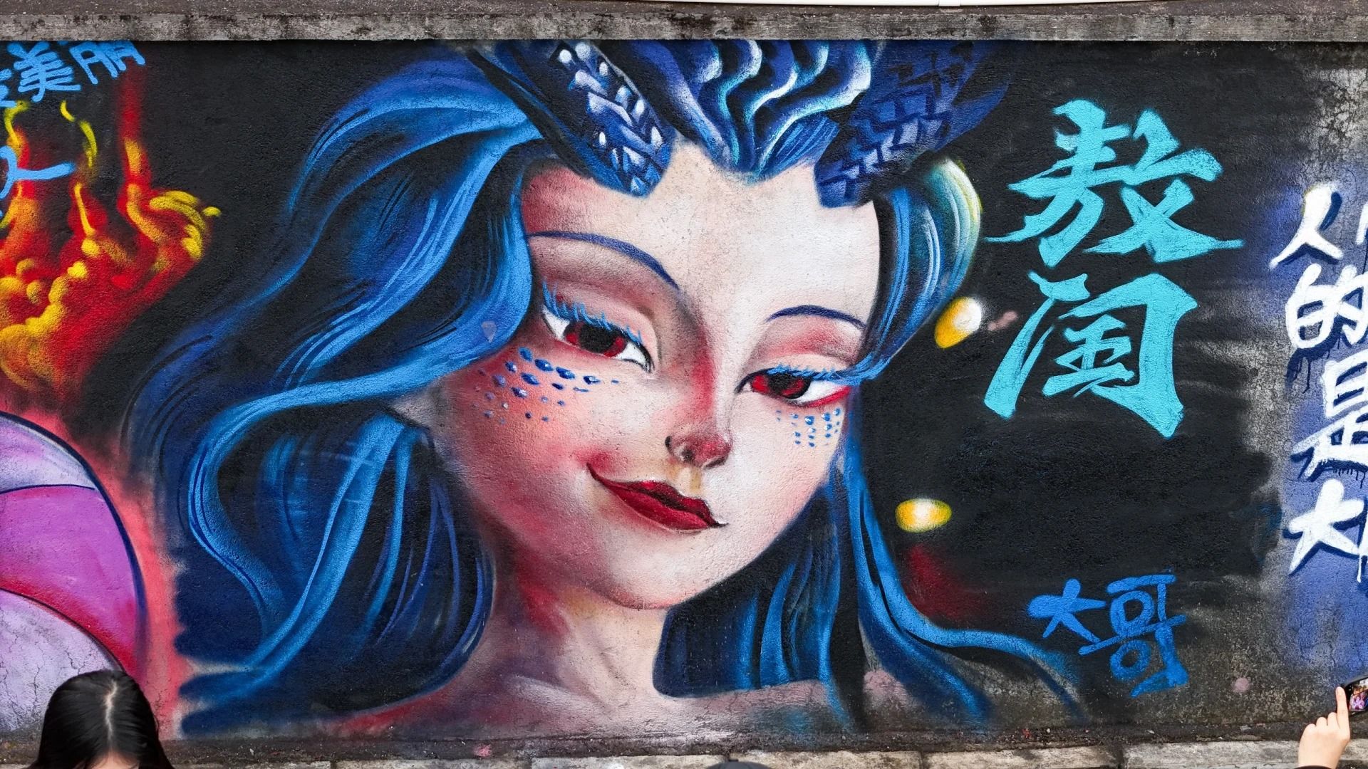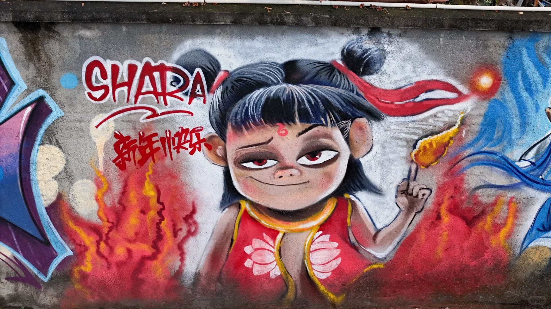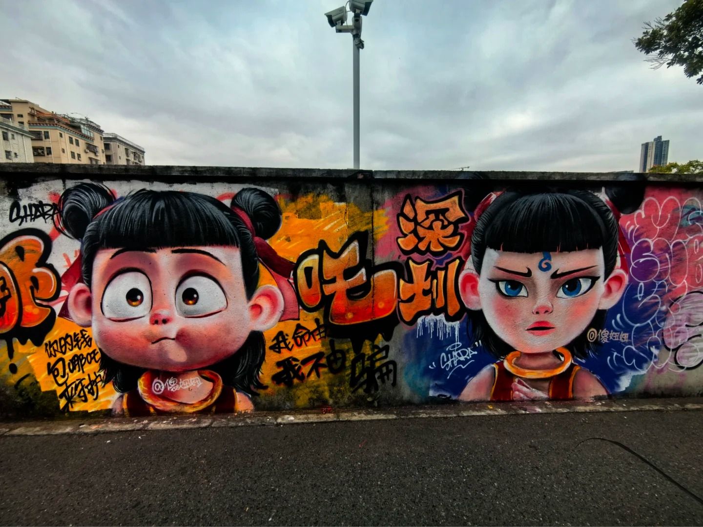 這幅哪咤主題塗鴉位於龍華區上芬社區西頭瓜地新村,這幅壁畫高 2 米、寬約 20 米,由「00 後」的彭丹和她的兩位朋友花了大約 3 日共同創作而成,2 月 15 日完成,她們都是戲迷,2月頭成功申請後便著手繪畫。