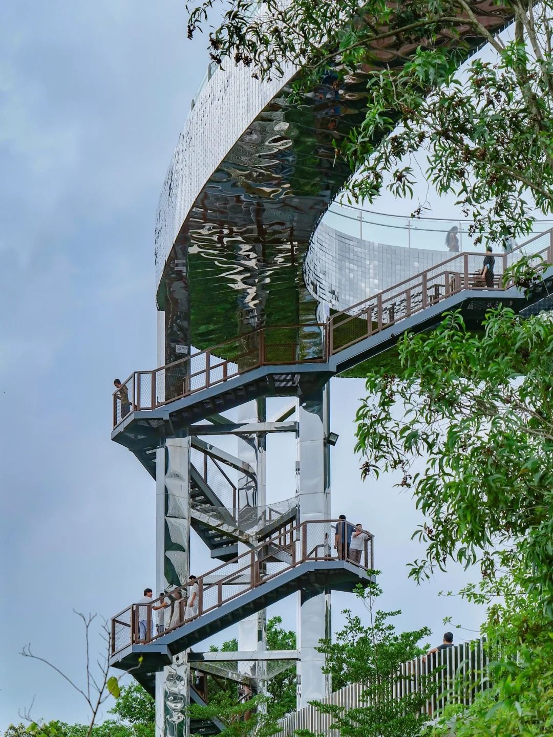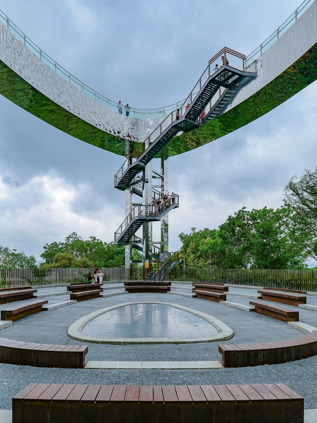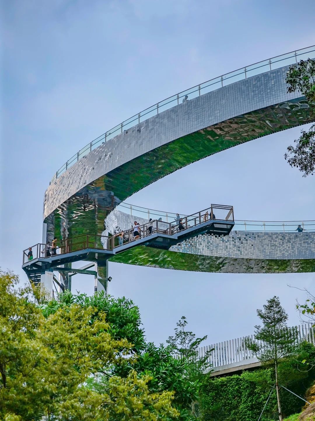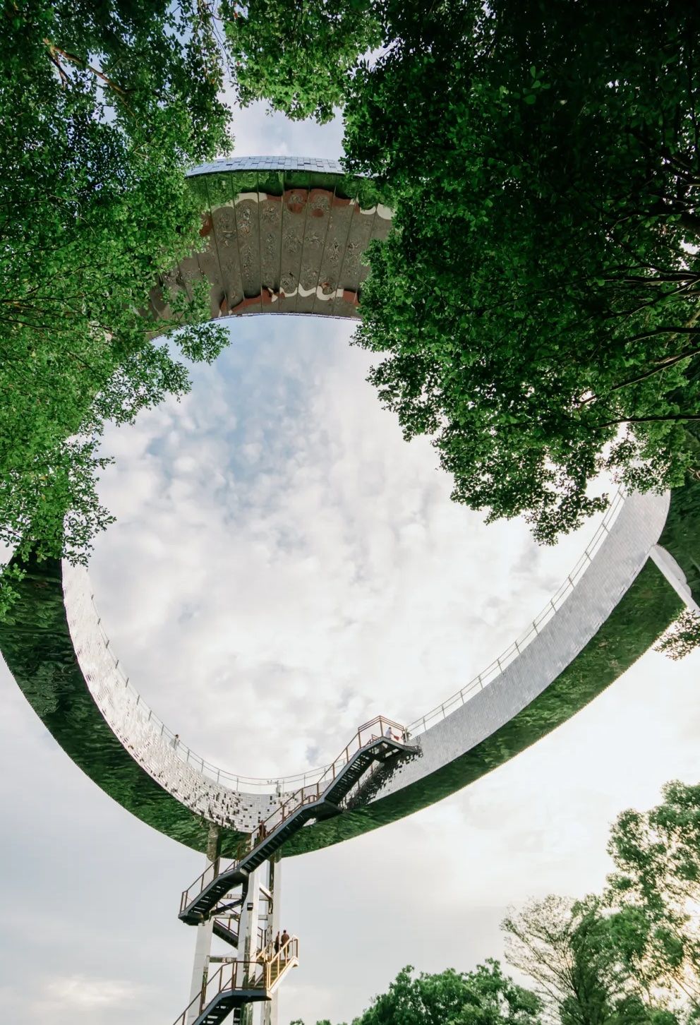 仰望|由天空之盾下方的休憩區向上望,會看到步道底部反射了周邊的森林