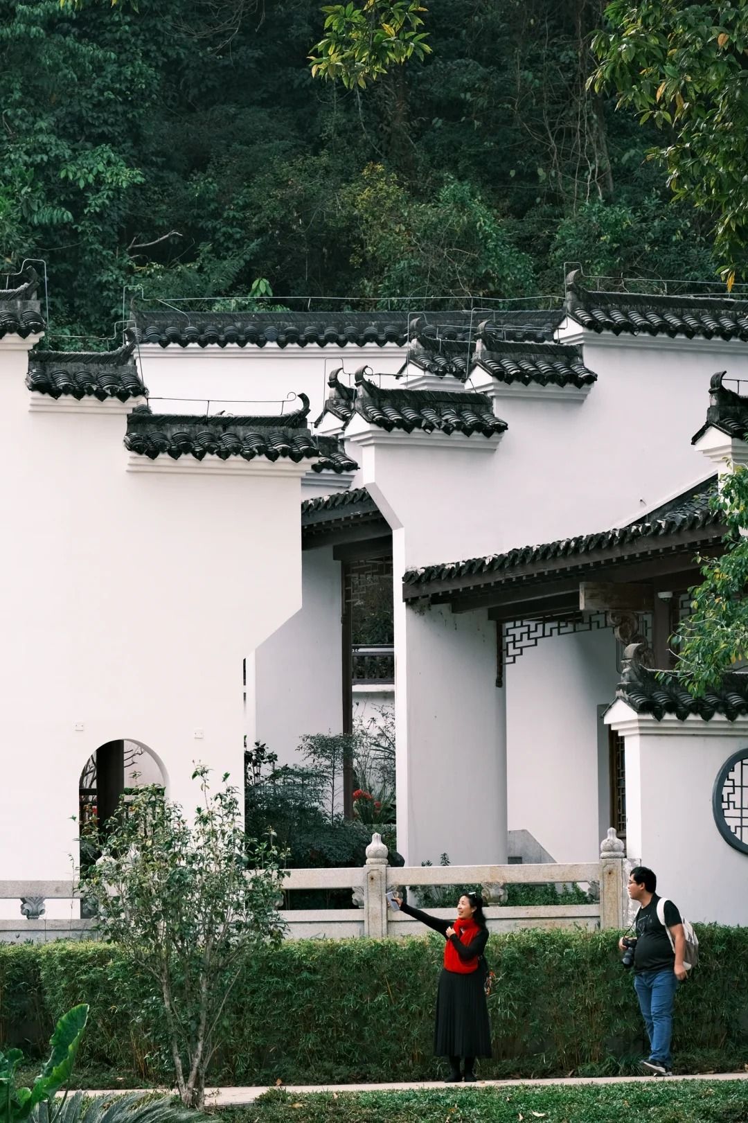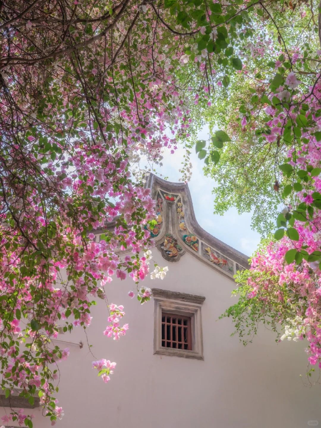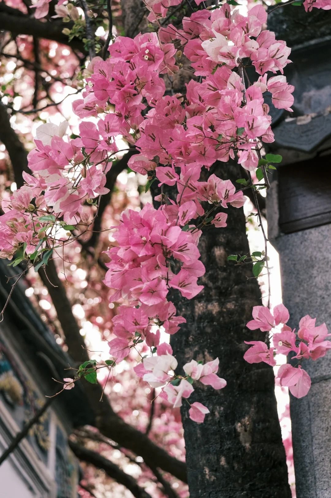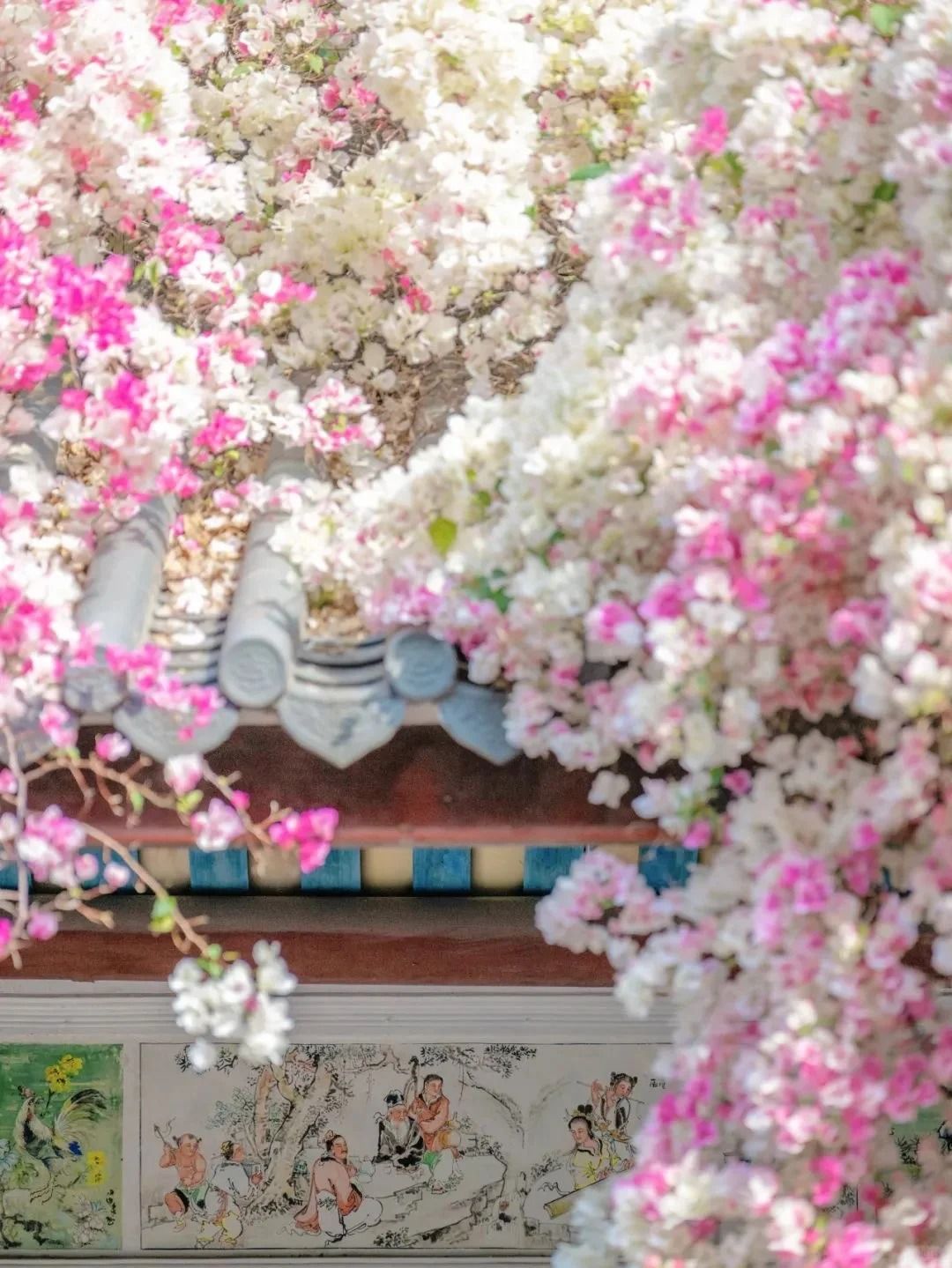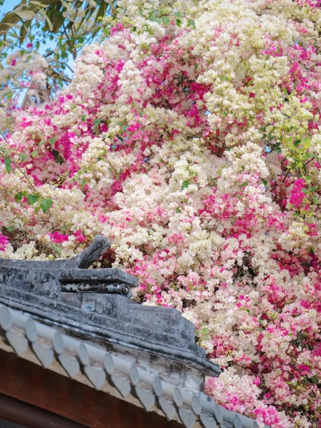 位於園博園的「匯芳園」,三角梅長在古色古香的中式庭園頂,垂落景色好美。