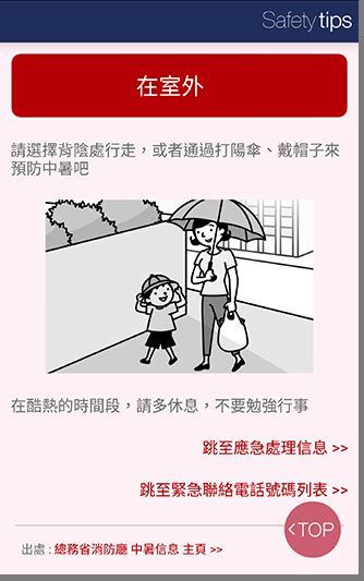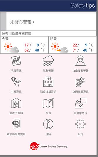 「Safety tips」是外國旅客專用的推撥通知資訊警戒應用程式,會告知關於地震速報、海嘯警報與其他日本國內氣象警報等警戒,可用語言包括英語、日語、韓語、中文(繁體)、中文(簡體)、越南語等。應用程式提供許多對外國觀光客與居民來說皆相當實用的各種功能,諸如疏散處理流程圖表,以告知在目前狀況下應採取的行動,災害應急會話則可以向周遭民眾獲取資訊,以及包含災害相關實用資訊的網站連結。