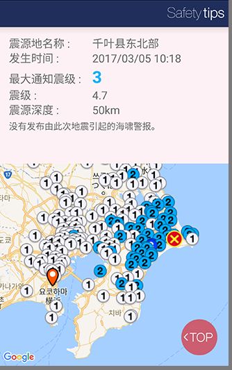 主要顯示日本各地的即時地震資訊,包括地震發生時間、震源、強度等,設有「現在這裡」功能,發生緊急情況時可自動連線至X/LINE,發送現在地點的地址和圖片。只限日文,不過以漢字和圖表顯示。