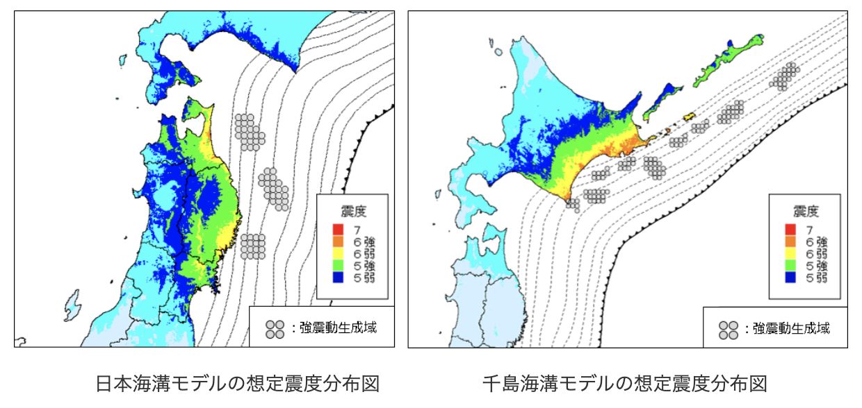 🔸 基於「日本海溝」(即311東北大地震震源)和「千島海溝」沿線過去發生的地震,設置了強震區域,並預測最大級別地震的烈度