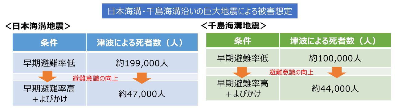 日本內閣府防災專頁(防災情報のページ-内閣府)預測千島海溝及311震源「日本海溝」若發生巨大地震受災的縣市及災害程度,兩者的受災程度均十分嚴重,千島海溝地震可能為一市引發28米巨大海嘯。