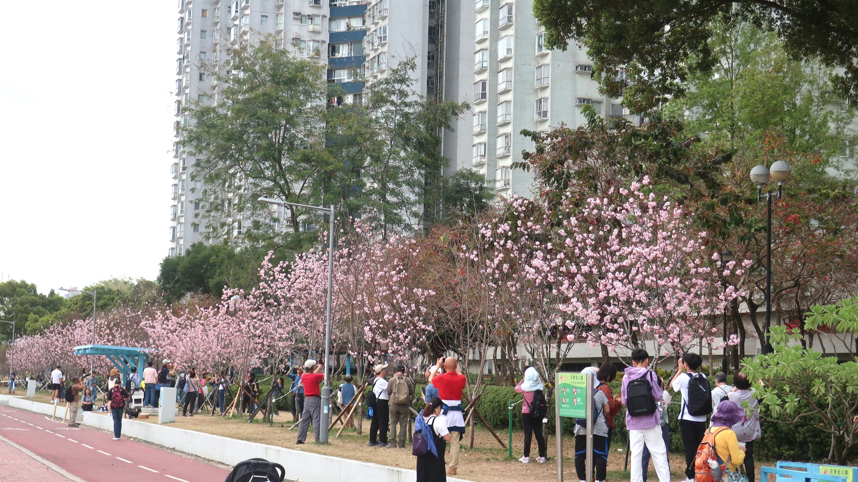 根據康文署賞花情報,這裏的櫻花盛開度已達4級(5級為滿分)。園內大約有 90 棵櫻花樹,品種比安景街公園更多,一共有7種,當中以八重櫻為主,花瓣遍紅、顏色濃艷。櫻花分佈較散,分布在草地滾球場、風箏區附近及露天劇場附近。