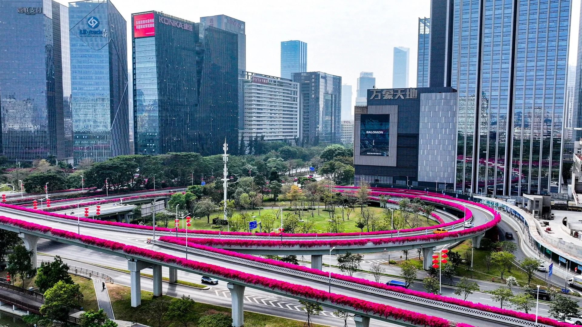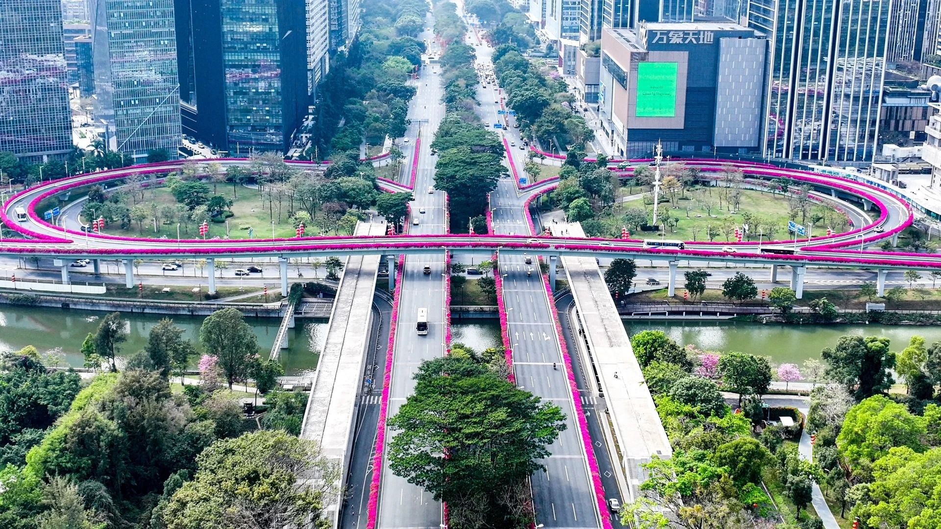 全長6公里,車路兩旁足足種了1.5棵簕杜鵑花,高空拍攝天橋好像飾上桃紅色的絲帶,形成一條「空中花廊」。這條深圳最美天橋,其實鄰近多個港人北上深圳熱門商場,去開這些商場吃喝玩樂,不妨抬頭看看打張靚卡。