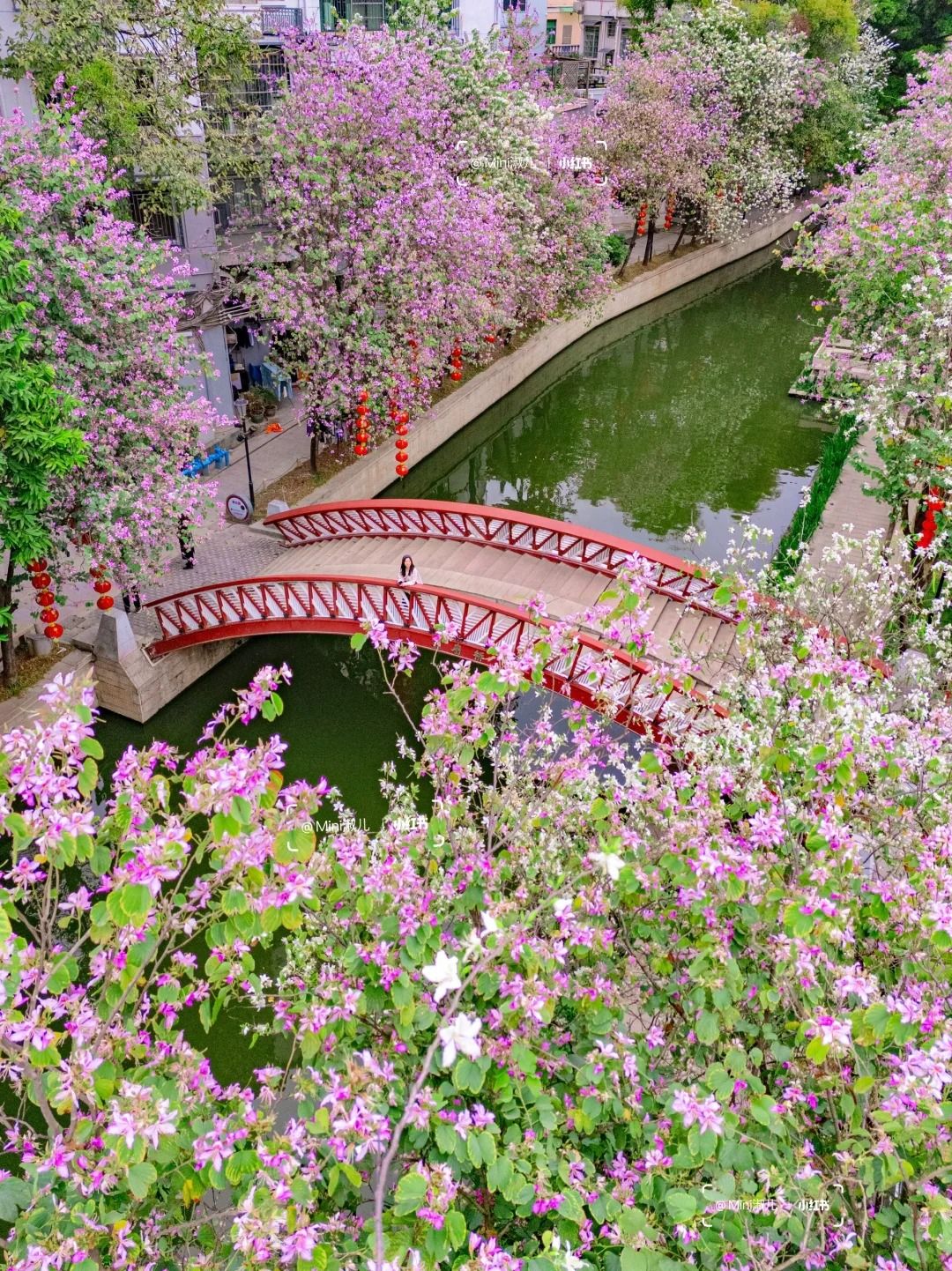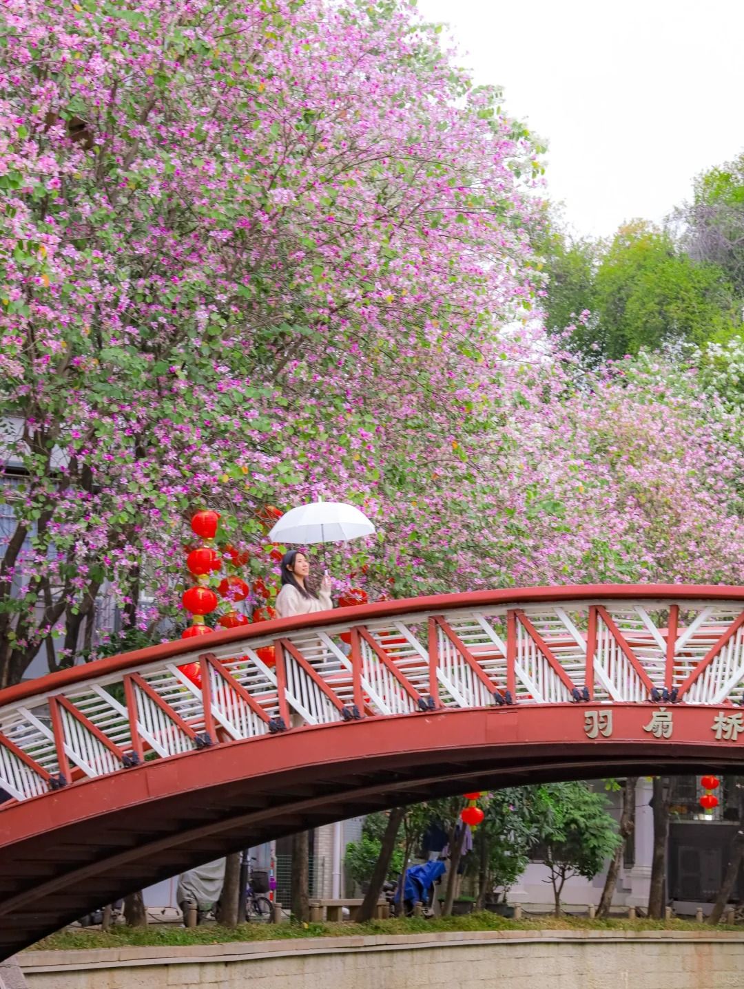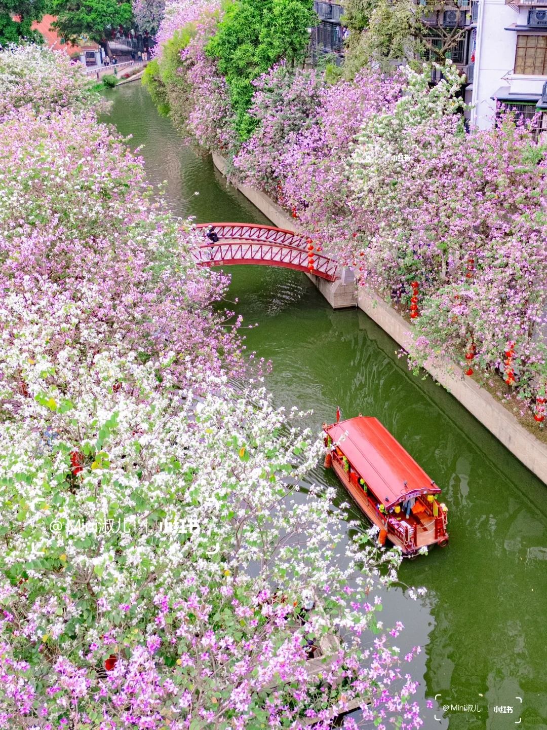 永慶坊荔枝灣的紫荊花大道沿荔枝灣湧兩岸分布,河道兩旁的紫荊花盛開時,河畔還有嶺南水鄉的古風建築,沿路有河、有小紅橋(羽扇橋),還有紅色觀花小舟。地鐵直達,免費。![]()