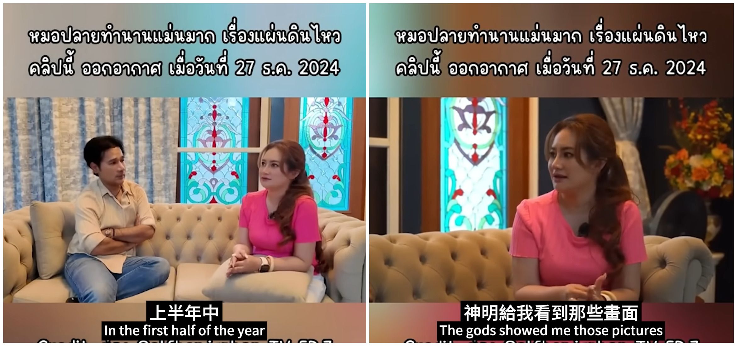 2024年12月接受訪問時,為2025年作出預言,她指有一件事會在上半年發生,就是地震了,地點就在緬甸,緬甸附近的府,甚至曼谷都會受到影響。主持人回應不太可能吧?Plai 師傅就說是神明給她的畫面,本來不太敢說出來,但就是要提醒民眾安全,她建議民眾要把財產放在安全的地方,如銀行,不然房子塌下來、大樓塌下來,會造成很多財物損失。