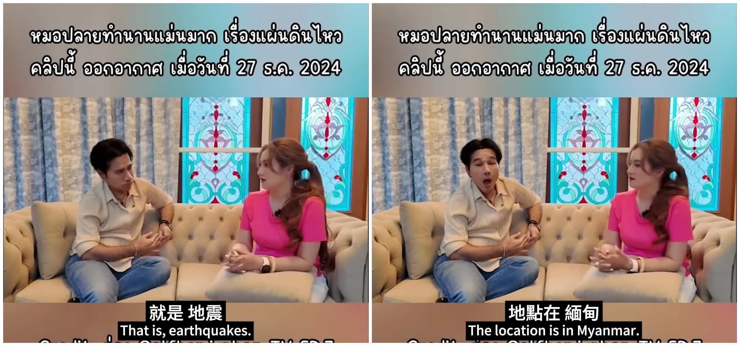 2025年3月28日,緬甸發生7.7級地震,連帶一向鮮有發生地震的曼谷都受嚴重影響,曼谷審計處大樓全幢倒塌、銅鑼區豪宅斷橋等情況,一日內發生30餘次地震,截至今日(3月31日)緬甸及曼谷都在搜救中。有關今次,曼谷罕有出現地震,有Youtube頻度「發現泰國著名的命理師Plai師傅於去年12月接受訪問時、100%準確預言今次地震的地點及時間。她亦有有關2025年上半年將會發生另一種災難,有意去泰國旅遊的朋友不妨留意。