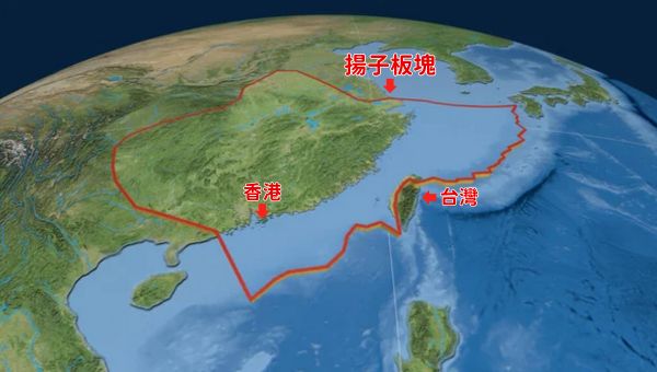 「揚子板塊」亦稱為「華南板塊」,覆蓋中國雲南、貴州、四川、重慶、湖南、湖北、浙江、江西、福建、廣東、廣西、江蘇南部、黃海、東海。