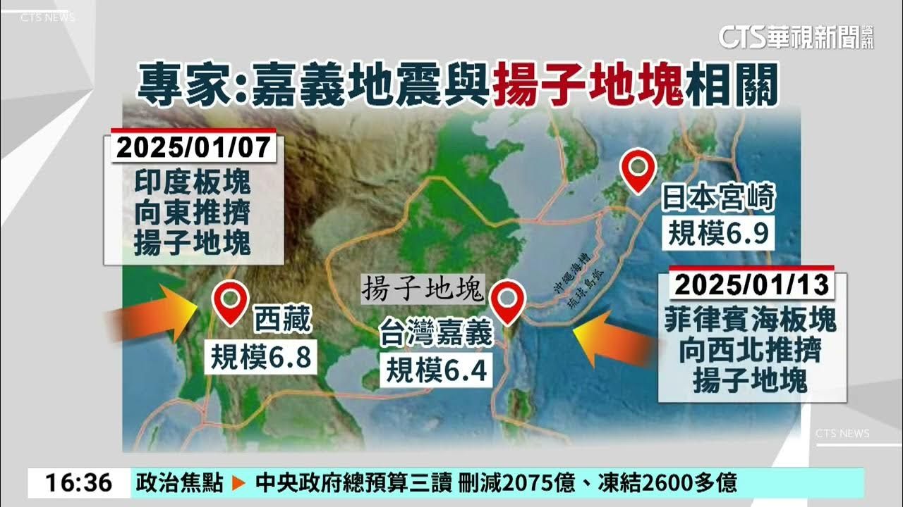 郭鎧紋指出,台灣西部的雪山山脈、嘉南平原及阿里山山脈等地區也在「揚子板塊」之上,未來2週內可能觸發規模6級以上的地震。他表示過去也曾出現類似情況,例如2025年1月7日西藏發生6.8級強震後,台灣嘉義大埔於1月21日發生規模6.4的地震、1月13日日本宮崎發生6.9級地震。