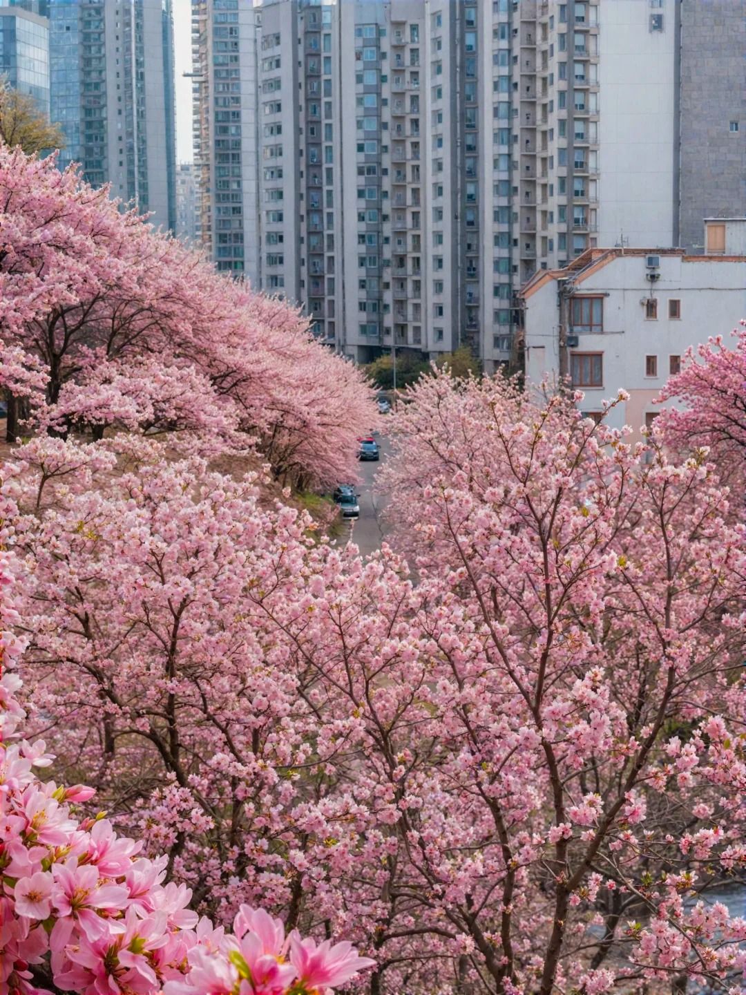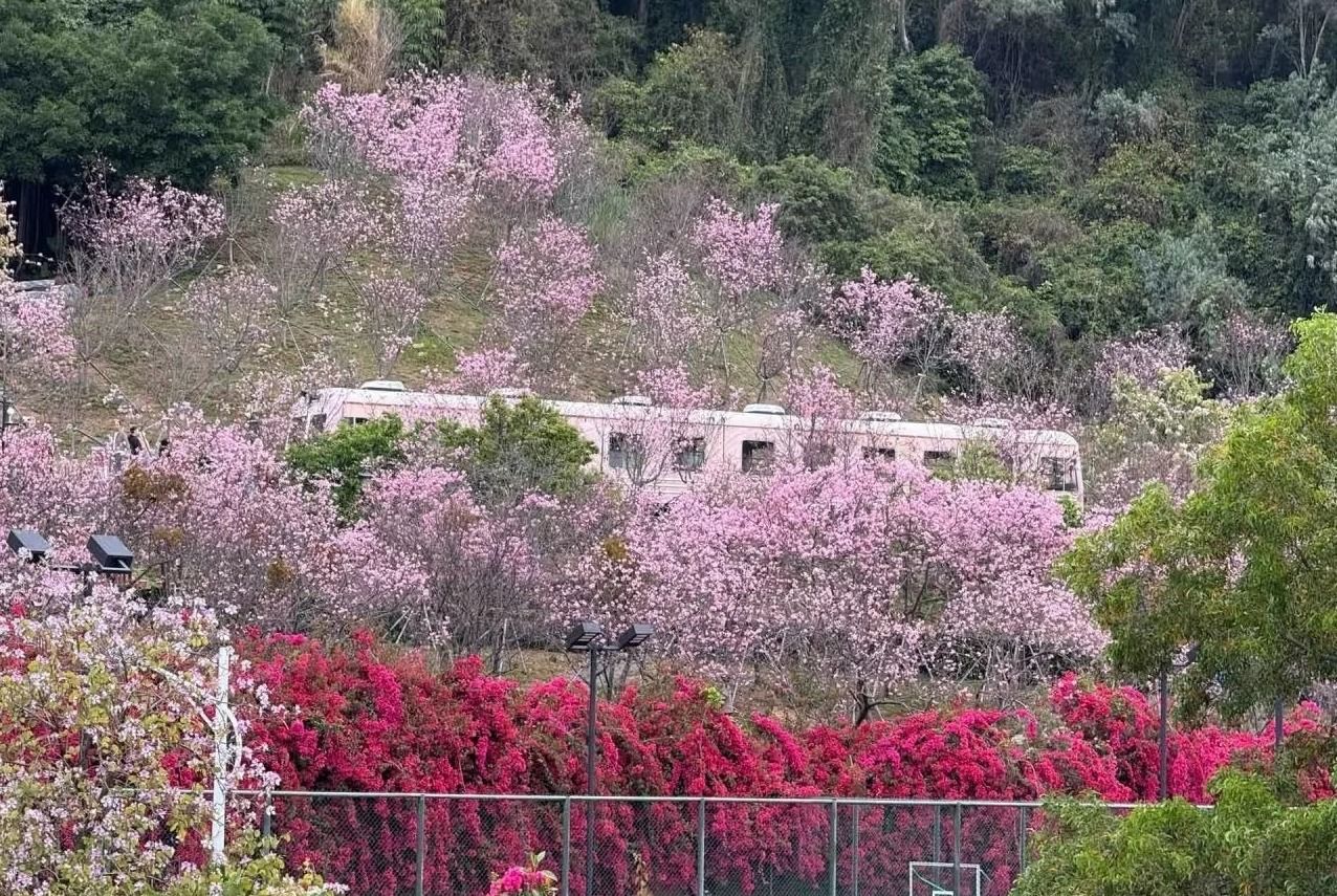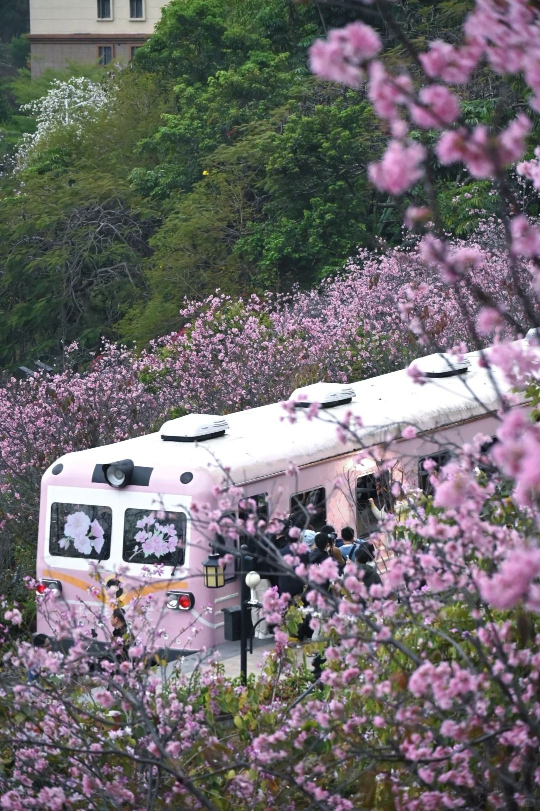 南山區的華英路櫻花主題公園裏的櫻花3月30日開始全面盛放,園內有一輛櫻花列車,粉嫩的櫻花圍着列車盛放,拍出來真的好像去了日本。