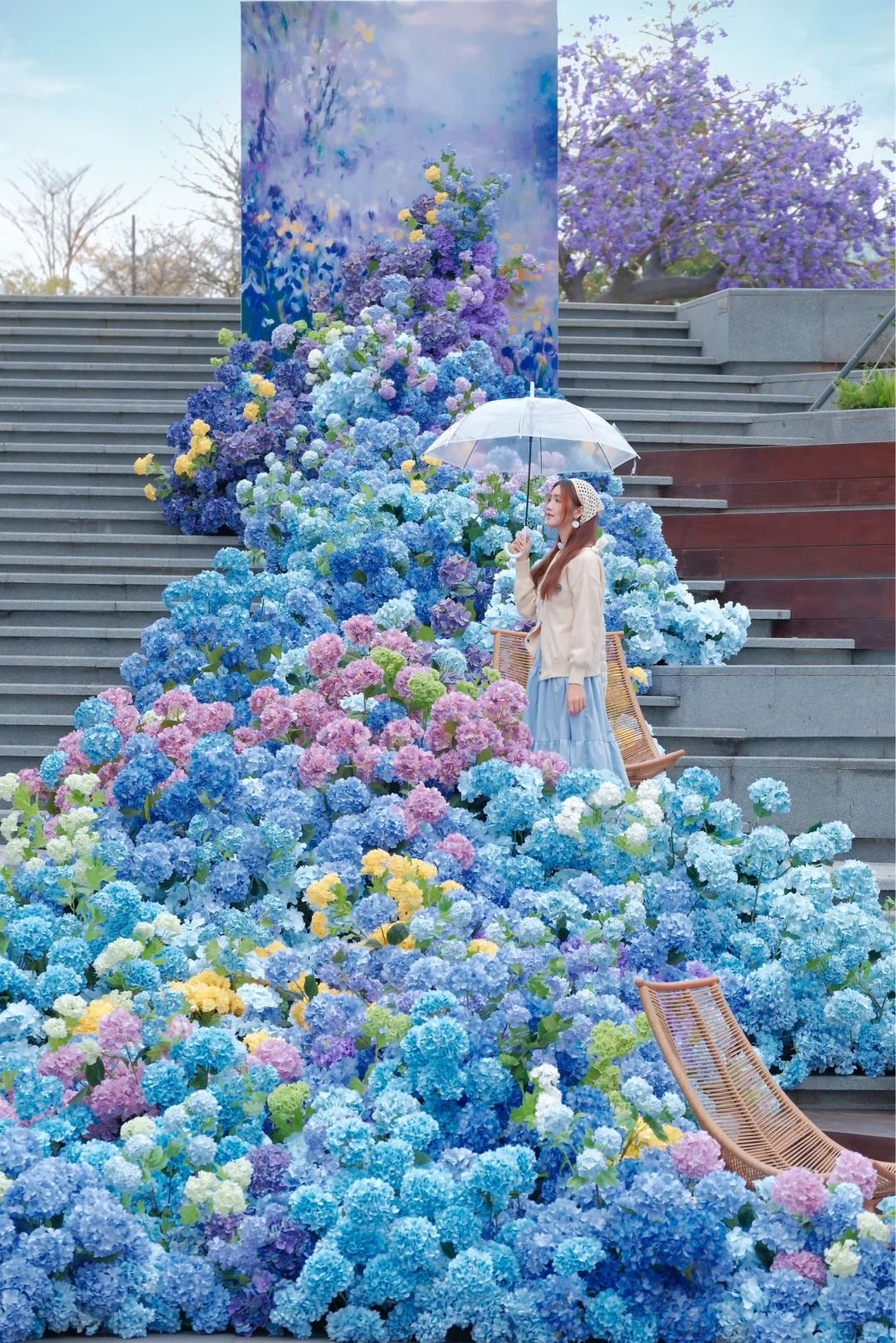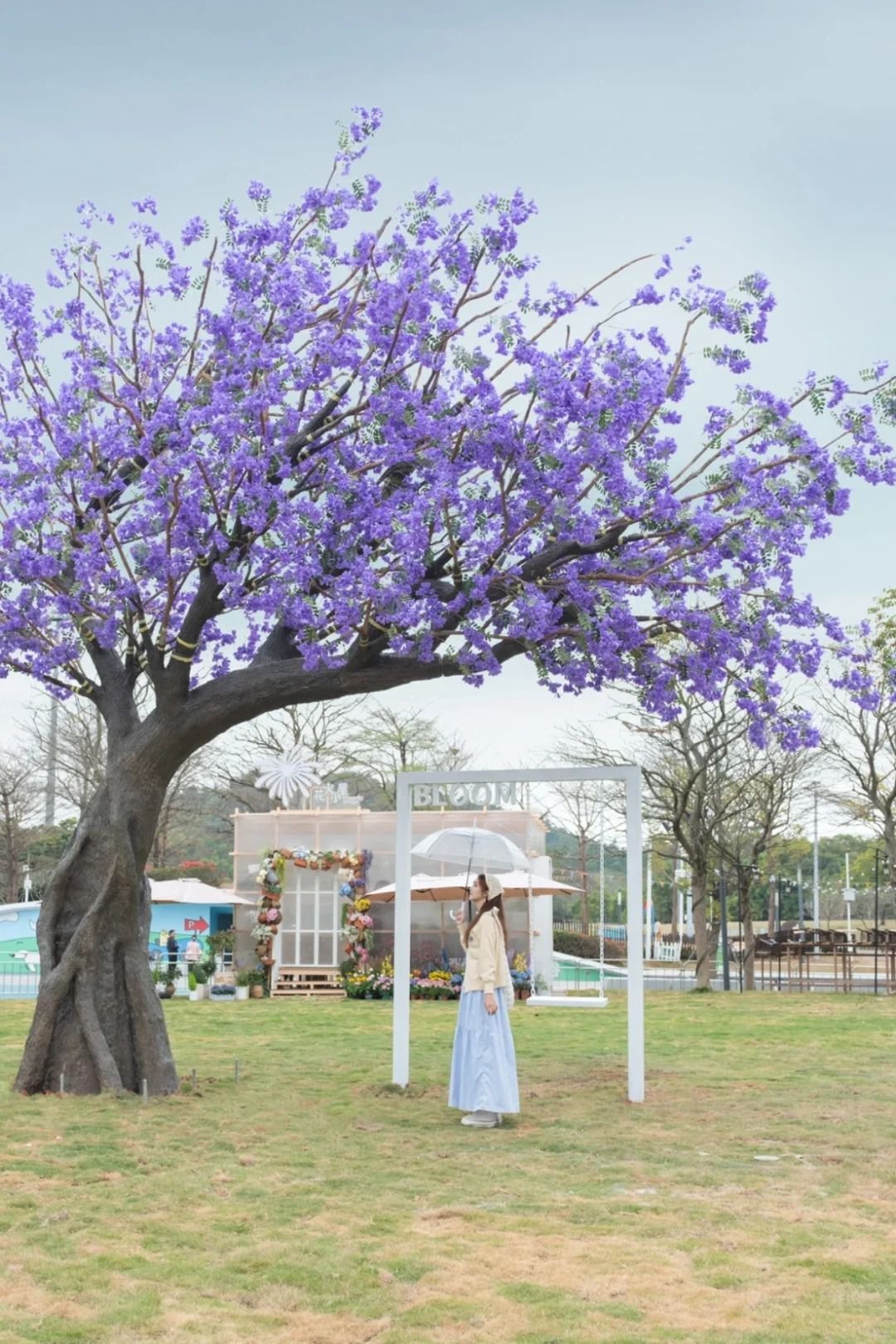 4️⃣ 中央廣場|8 米高的藍花楹樹,還有花花韆鞦,這區還會定時下花瓣雨