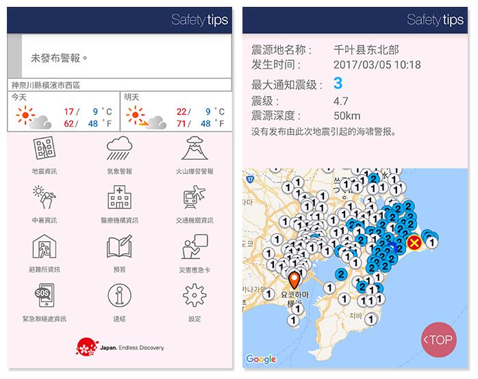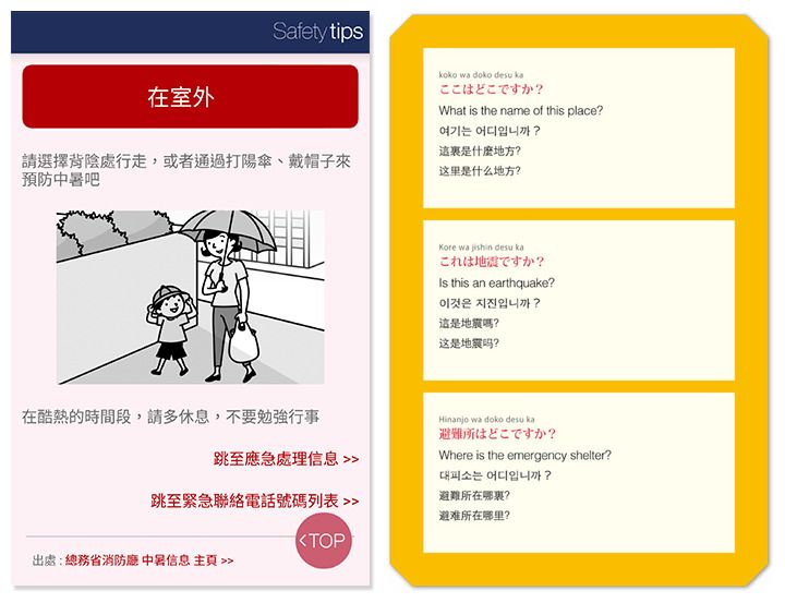 為外國人而設的 Safety tips 手機程式提供地震、海嘯、氣象、火山噴發、中暑等訊息,設有中文版的災害警報訊息,亦有疏散流程表及設有災害應急會話功能。