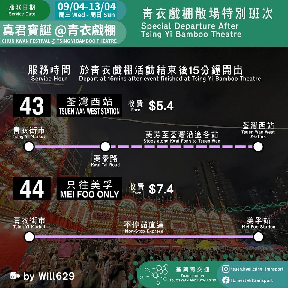 4月9日至13日「真君寶誕」期間,青衣戲棚會有散場特別班次,分別前往荃灣西站及美孚於青衣戲棚活動結束後15分鐘開出,方便市民。