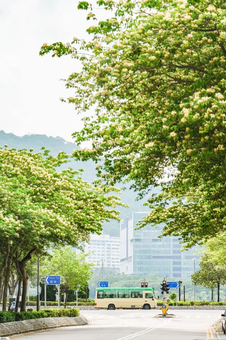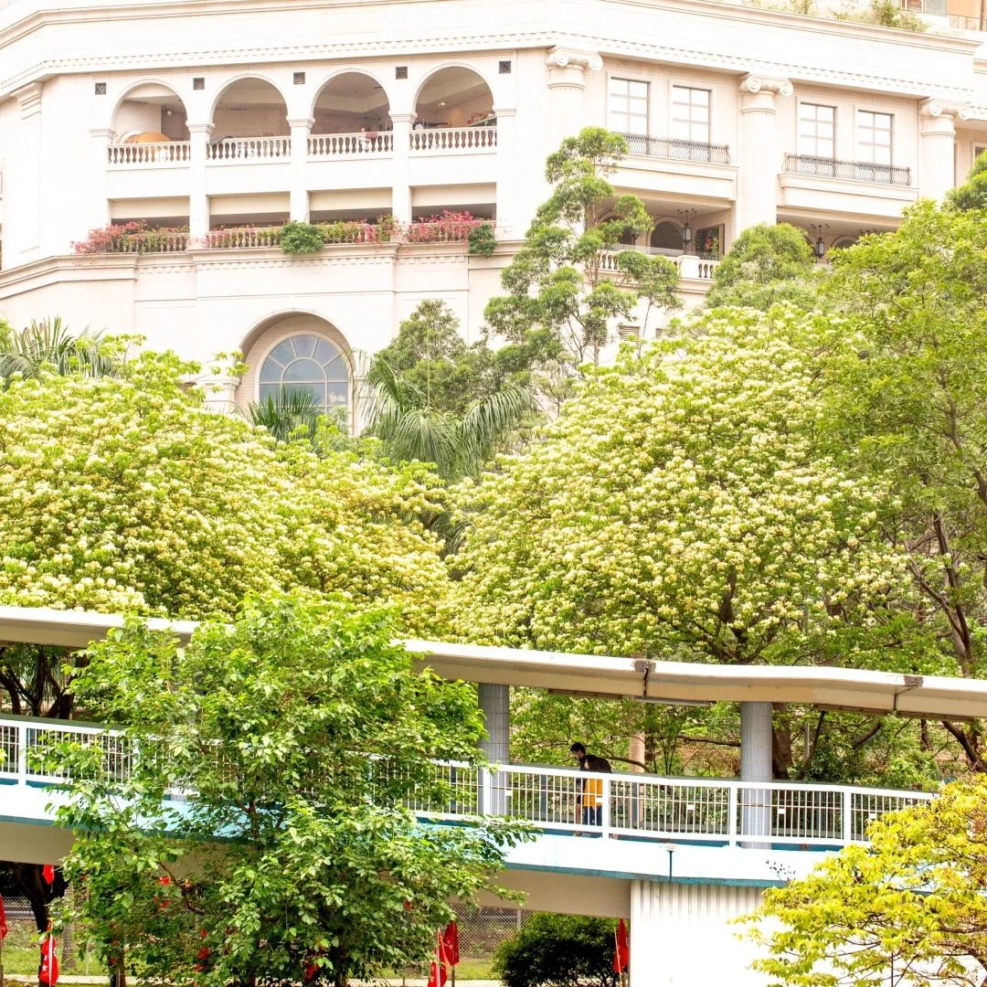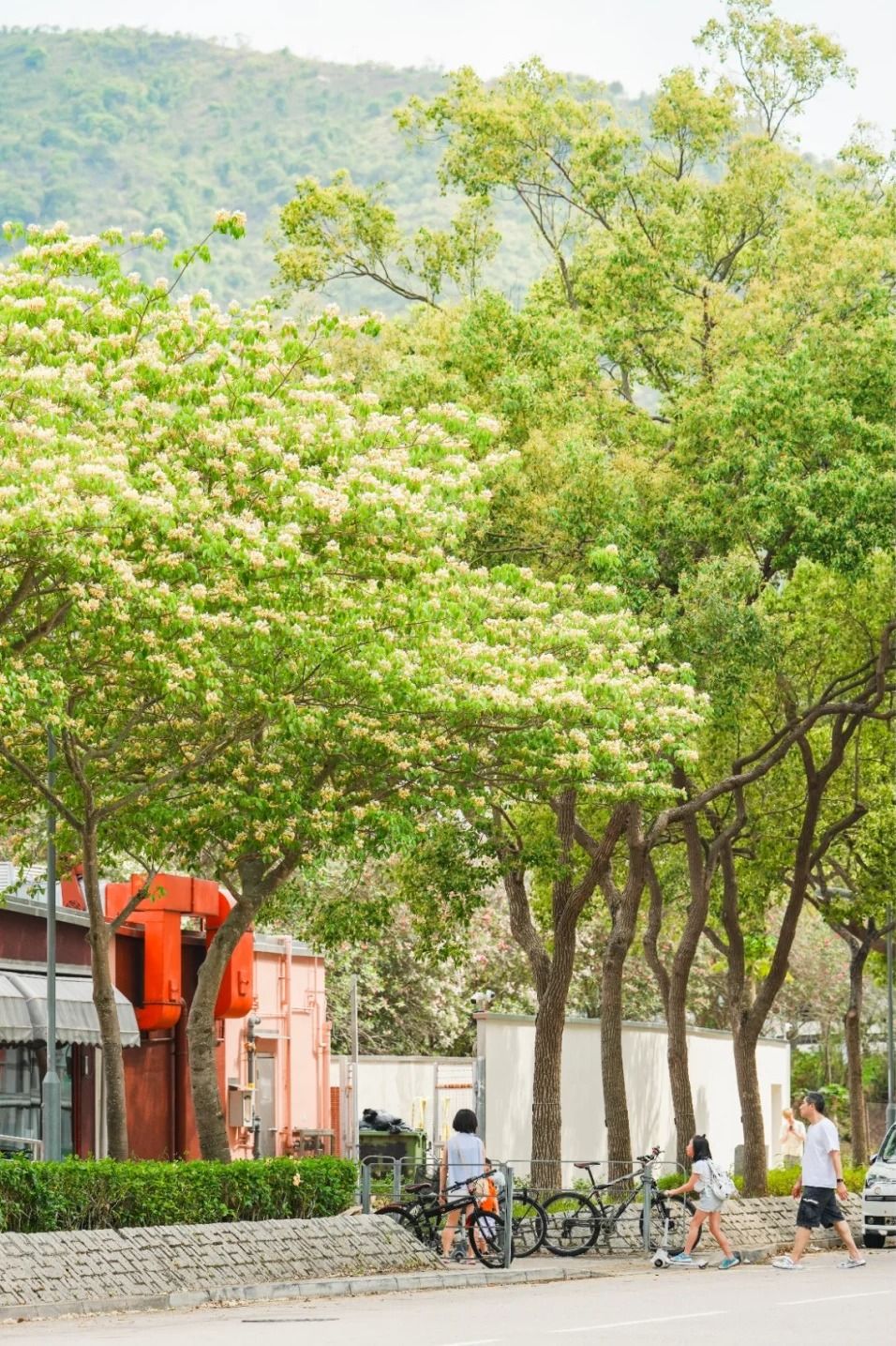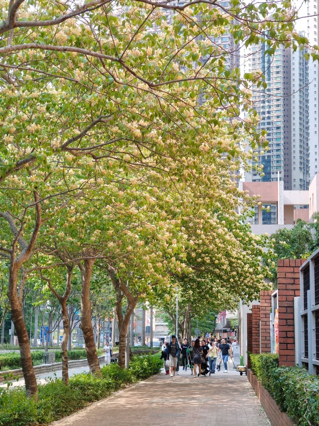 沿路種了不少魚木花樹,拍攝背影有單車徑、屋苑及商場等。