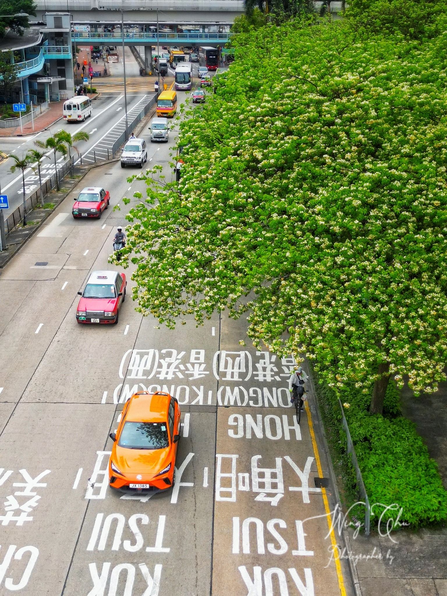 由太子帝京酒店出發至雀仔街方向,街上有不少魚木花開,部分魚木花更在天橋向下垂,主角可站在橋上,由下而上向拍照。